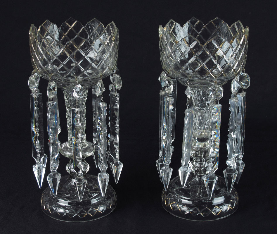 PAIR OF CUT GLASS LUSTERS: Cut stems, extra long crystal prisms. Approx. 13 1/2'' tall.