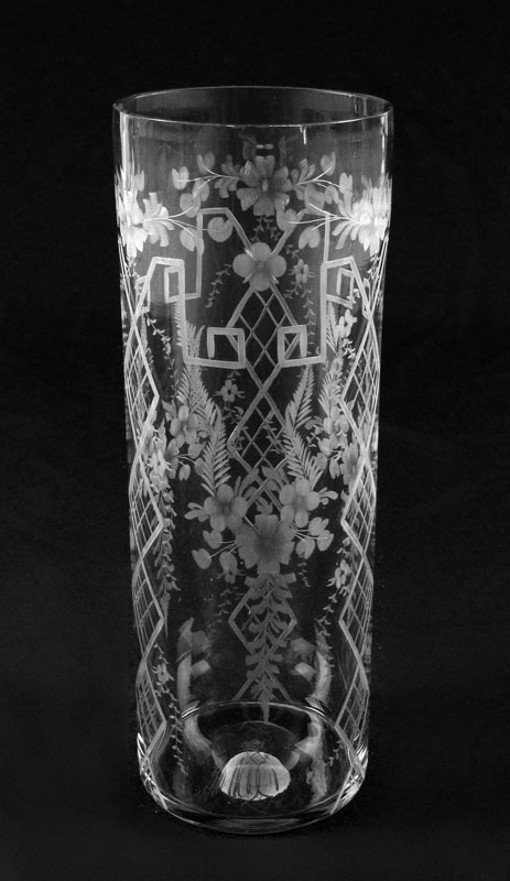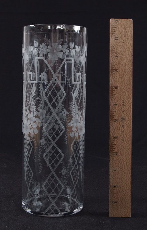 SIGNED HAWKES CUT GLASS VASE: Floral and geometric pattern. 11 1/2'' h. x 4''.