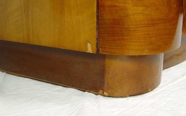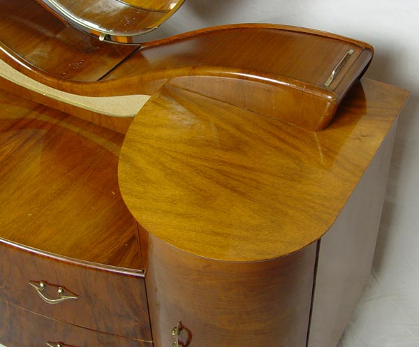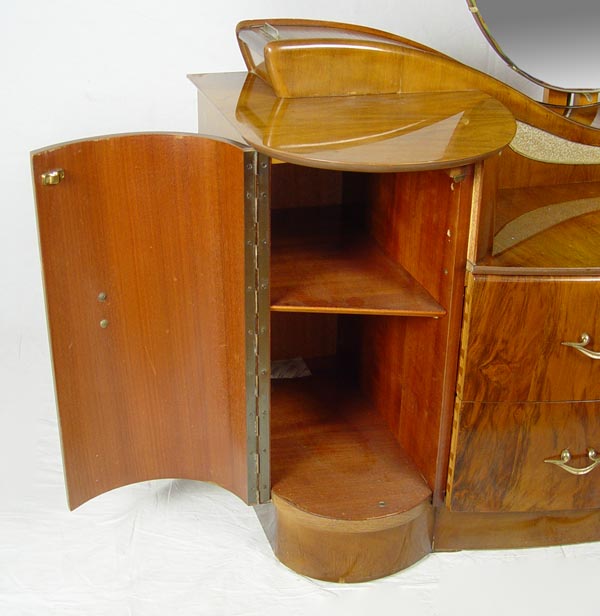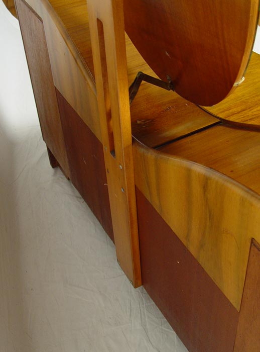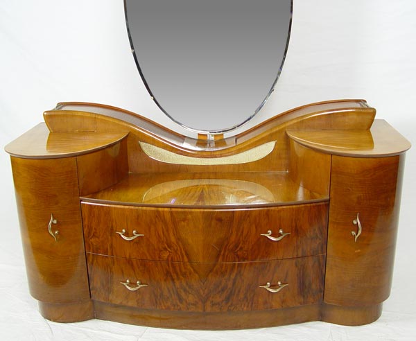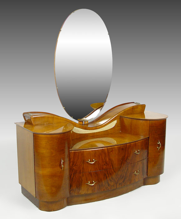 ART DECO TAMBOUR VANITY WITH MIRROR: Oval pivoting mirror over unusual tambour compartments. Center drop front flanked by curved ends with drawers. 1 over 1 drawer in center. Honey color butterfly veneer. Approx. 5 ft. tall x 51 1/2'' wide x 19 1/2'' deep.