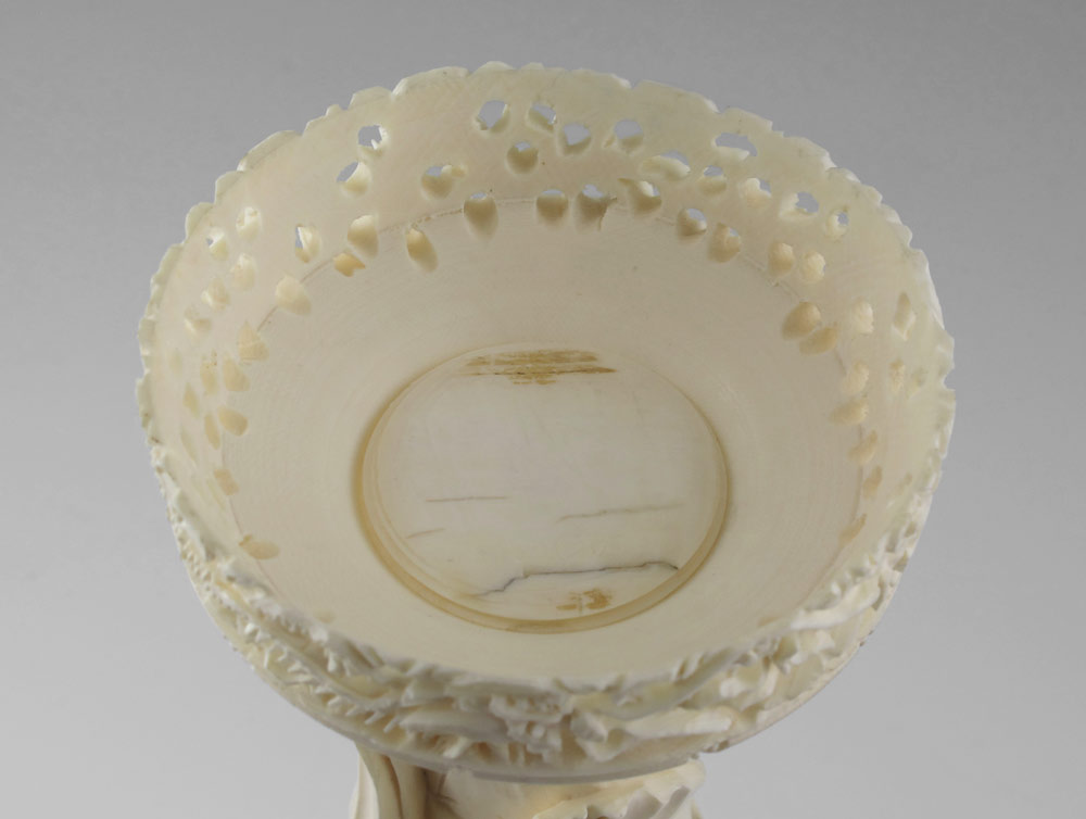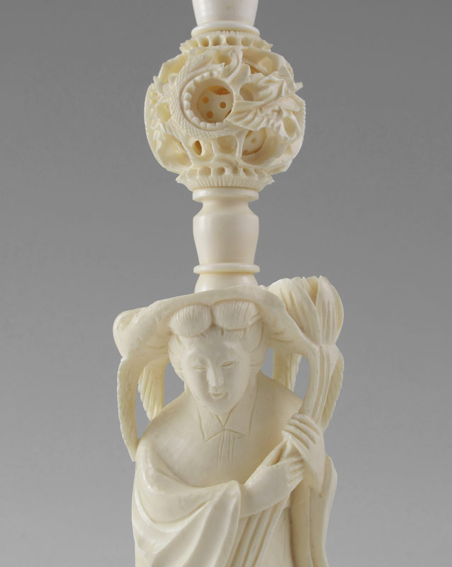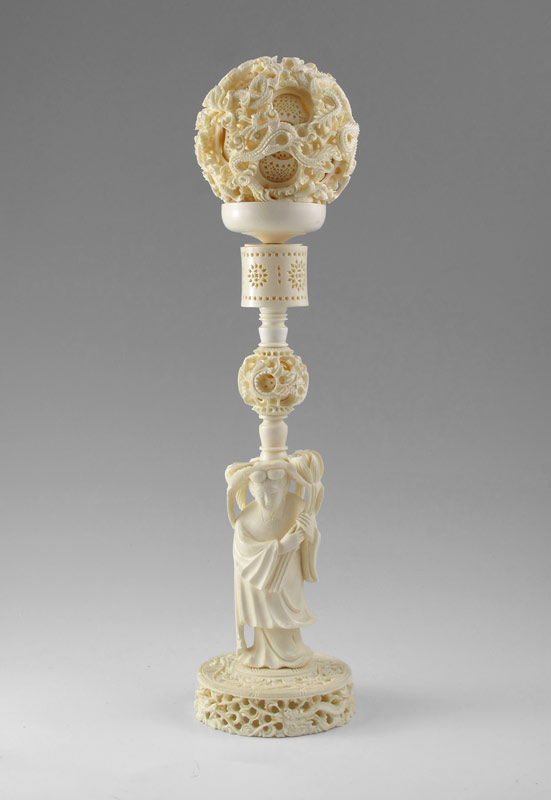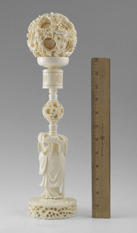 LARGE CARVED IVORY MYSTERY BALL ON FIGURAL STAND: Carved and pierced 3 3/4'' dia. ball with dragon motif, approx. 16 internal layers. Sold with figural stand, featuring carved woman with flowers, mystery ball and carved and pierced base. Stand measures 12 1/4'' h. x 3 7/8'' dia.