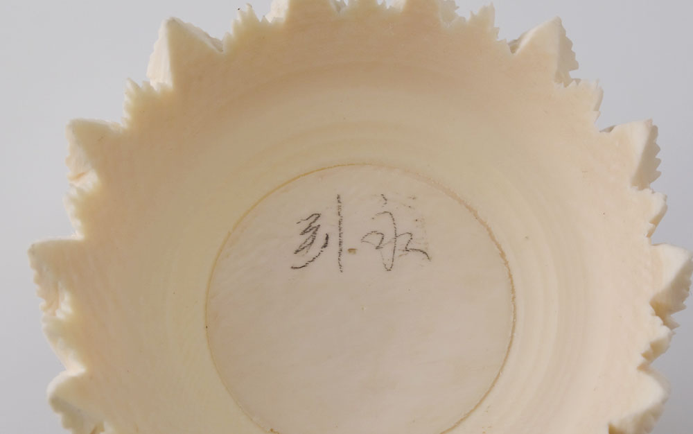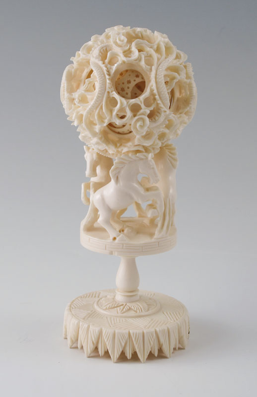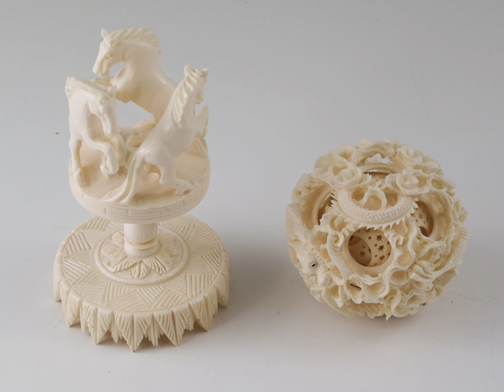 CARVED IVORY MYSTERY BALL ON HORSE STAND: Carved and pierced ivory mystery ball with dragon motif, approx. 7 interior layers, 2 3/8'' dia. Sold with carved stand with 3 figural horses over carved base. 3 7/8 h. x 2 1/2''.