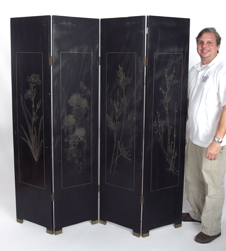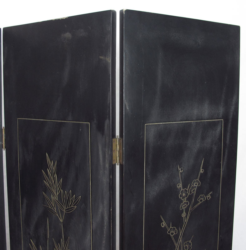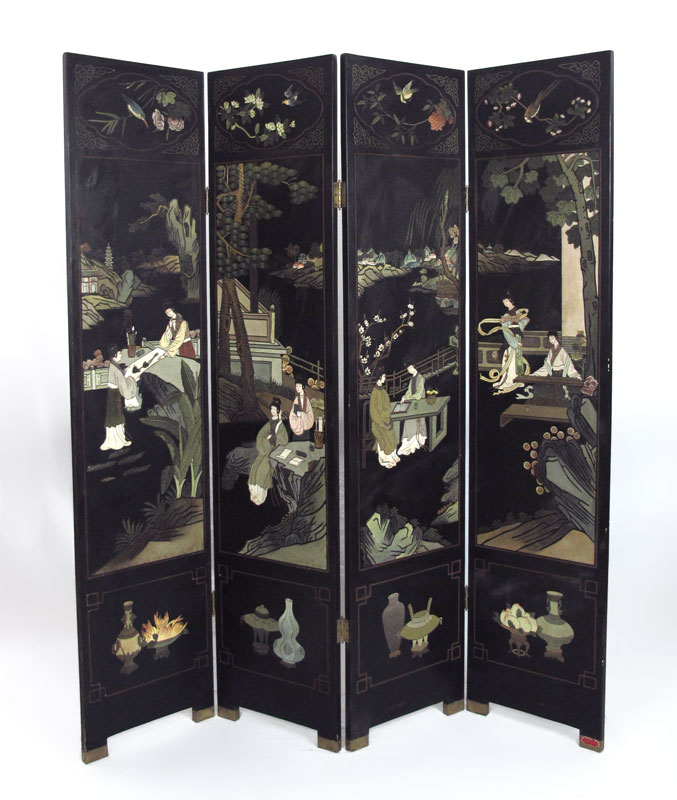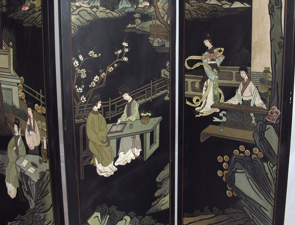 JAPANESE 4 PANEL COROMANDEL SCREEN: Depicting women enjoying the arts of music, needlework, game, and study. Measures 6 ft. in height, each panel 16'' wide.