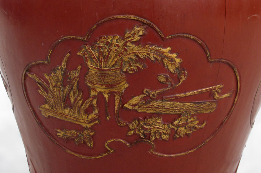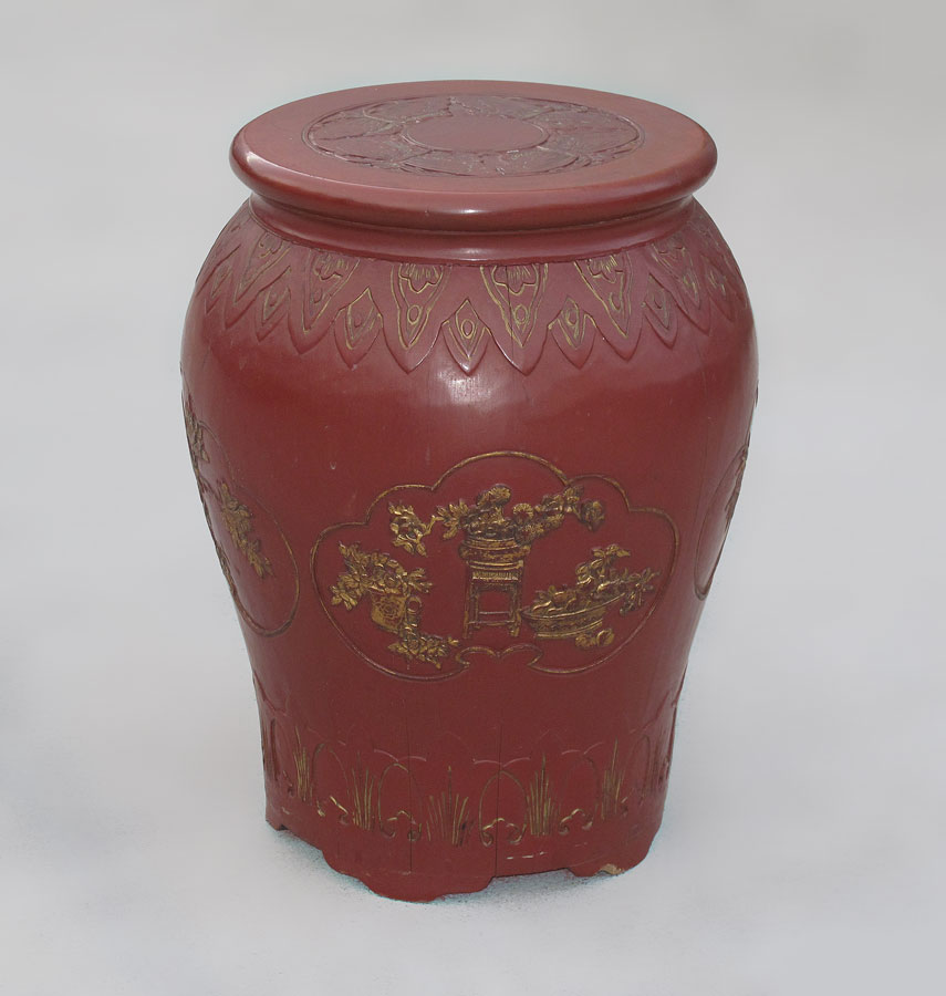 CHINESE RED LACQUER CARVED WOOD STOOL: Finely carved with gilt enhancements. Measures approx. 19 1/2'' tall, the rim is 12'' dia.
