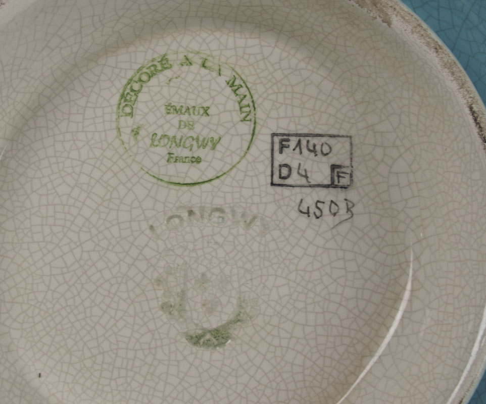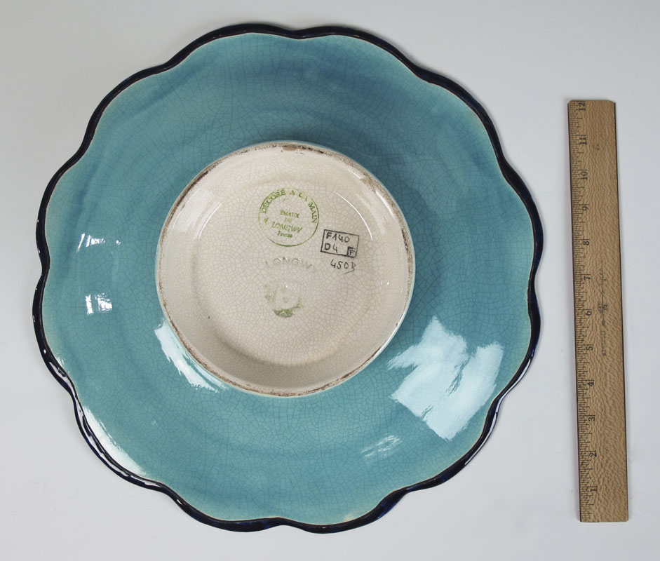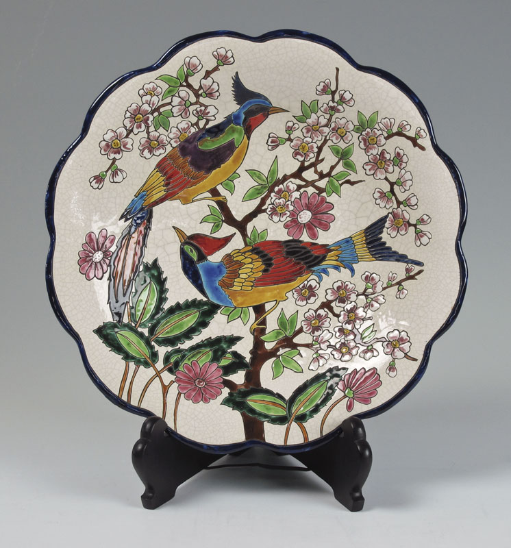 LONGWY FRENCH EARTHENWARE FOOTED BOWL: Birds of Paradise on cherry blossom branches motif. Impressed and underglaze Longwy markings. 3 1/2'' h. x 14 3/4'' dia.