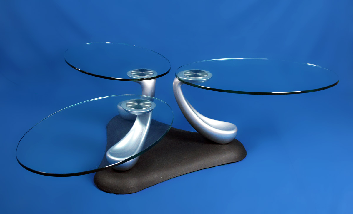 NAOS TREFLE ITALIAN MODERNE COFFEE TABLE: Articulated 3 level shelves. Marked with Naos tag. Open measures 16 1/2'' h. x 60'' dia., closed 39'' dia. Retails for over $3000 new.