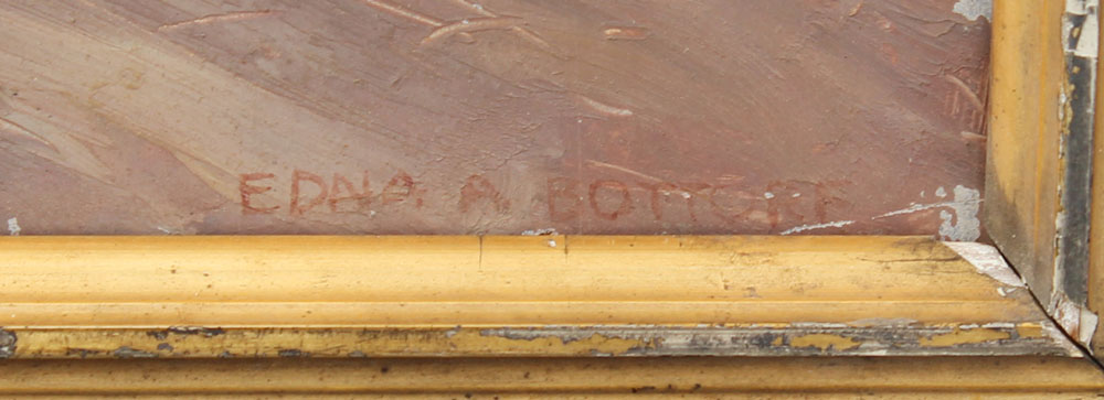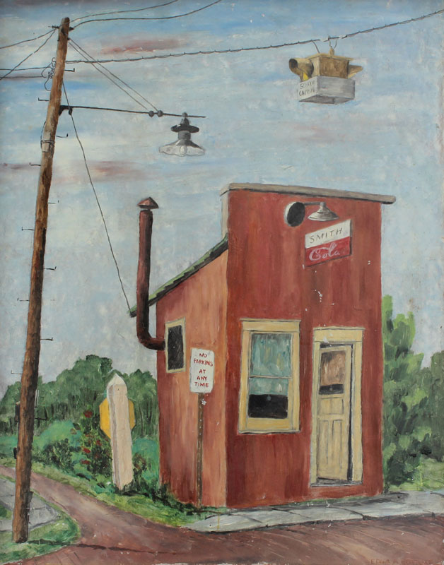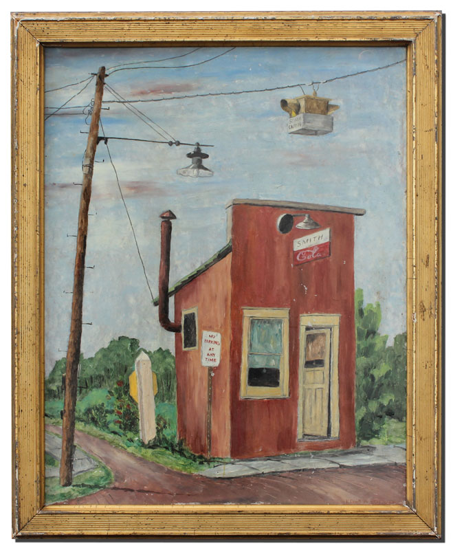 BOTTORF, Edna, (American, 1901-?): ''Smith/Cola'', depicts a Country Town Intersection with Corner Store, OIL/Masonite, 20'' x 16'', signed lower right, worn gilded gesso frame, 22 1/2'' x 18''.