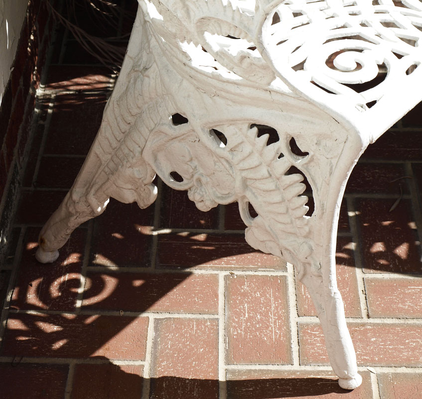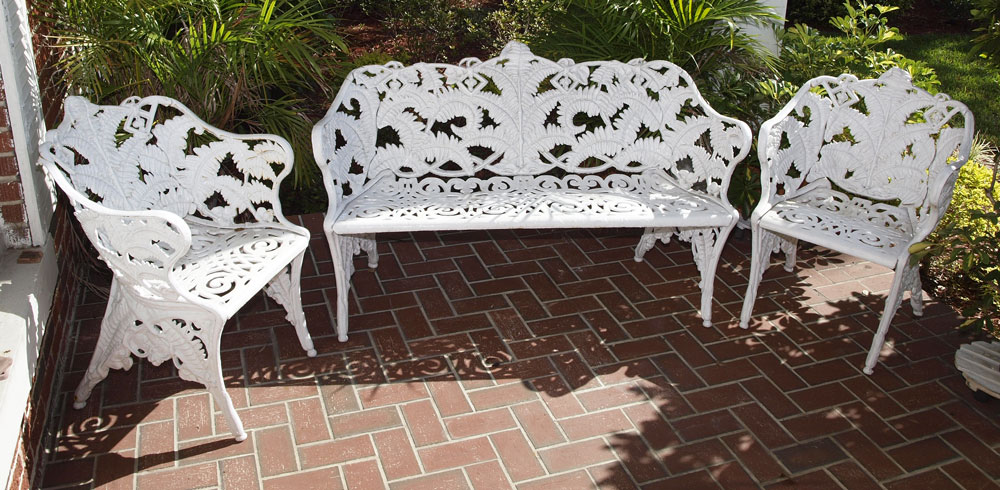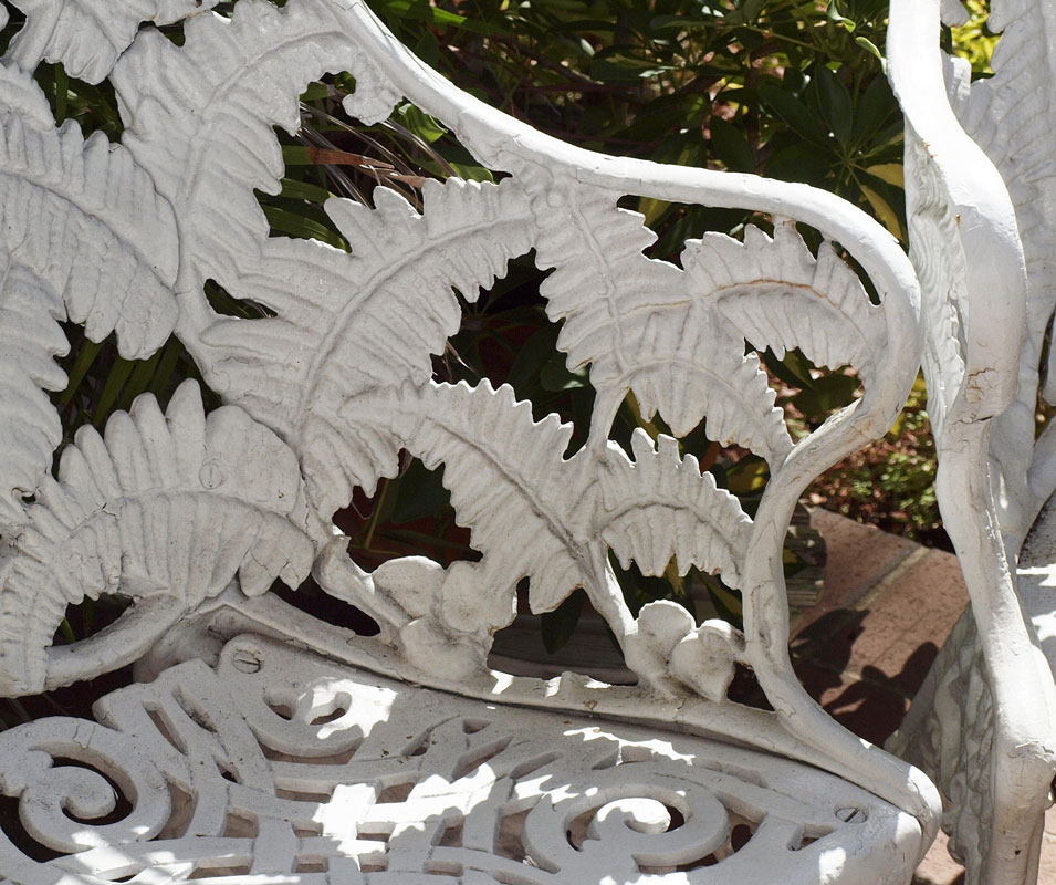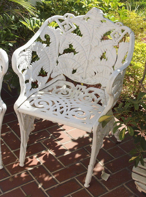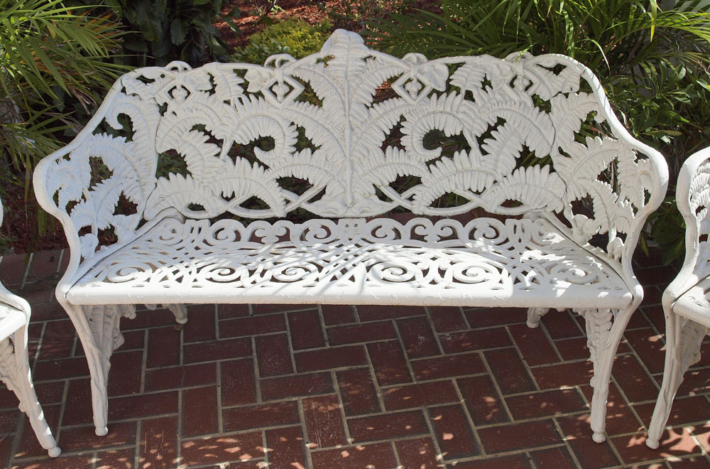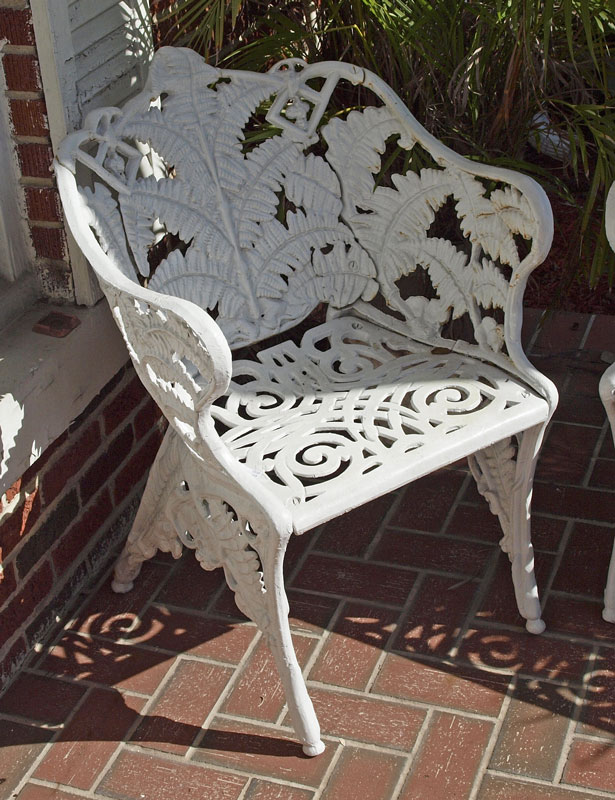 McHOSE & CO VICTORIAN ERA CAST IRON GARDEN BENCH AND CHAIRS: 3 piece in fern frond and blackberry design. Bench (33 1/2'' x 52'' x 21 1/2'') and 2 chairs (32 1/2'' x 23 1/2'' x 24''). White painted finish.