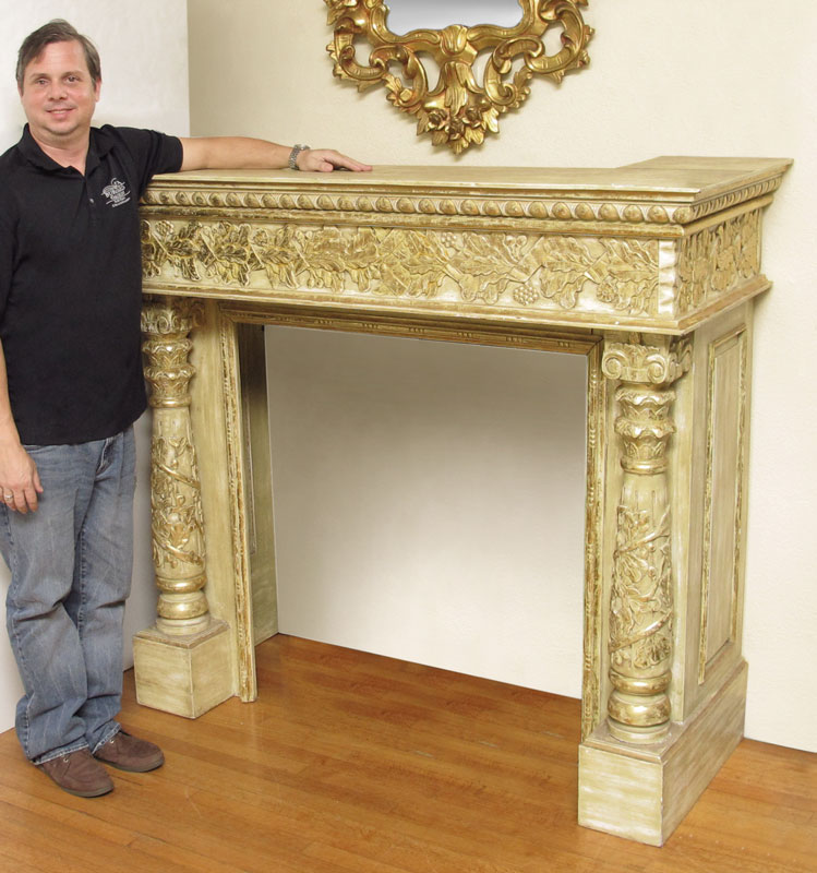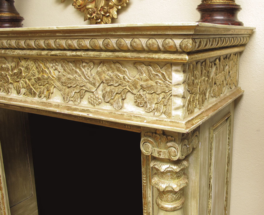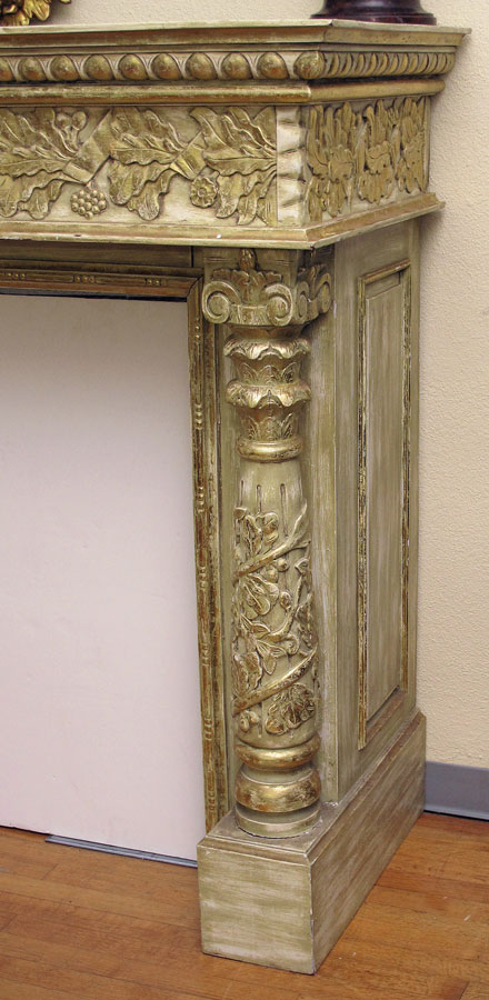 LARGE CARVED PARCEL GILT FIREPLACE MANTLE: Ornately carved with grapevine motif. Deep mantle with full column supports. 55 1/8'' h. x 62 1/4'' x 26 1/4''.