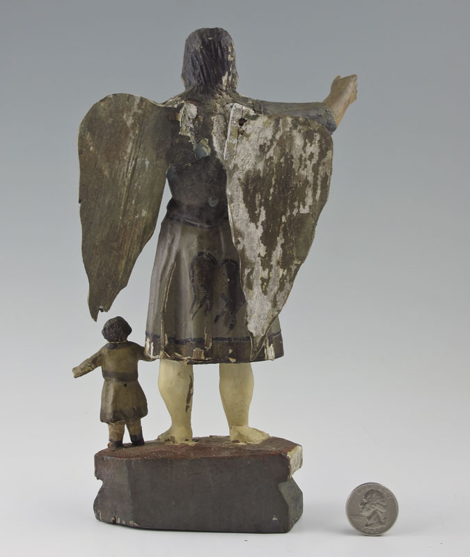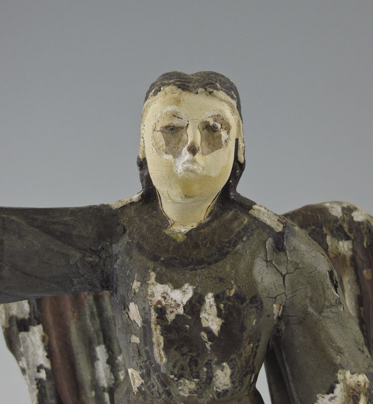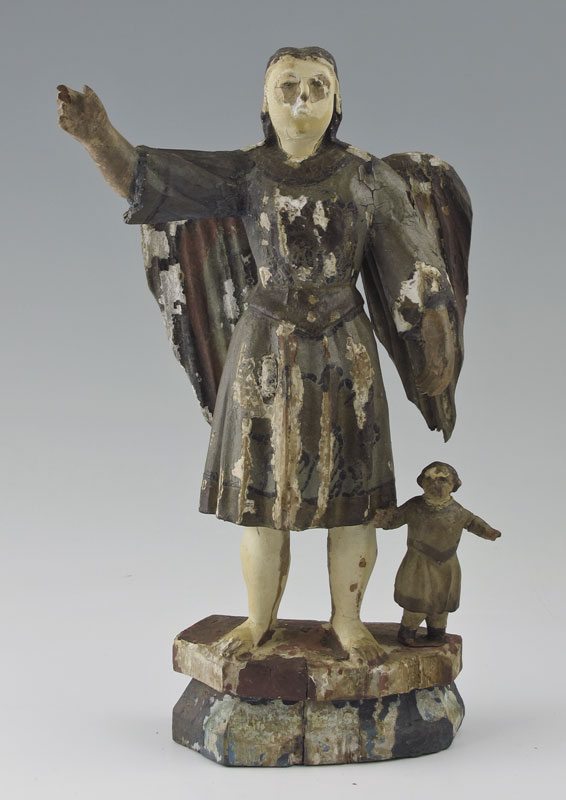 EARLY CARVED SANTOS: With wings and child. Polychrome with paint remnants, 9 1/2'' tall overall.