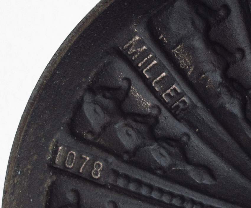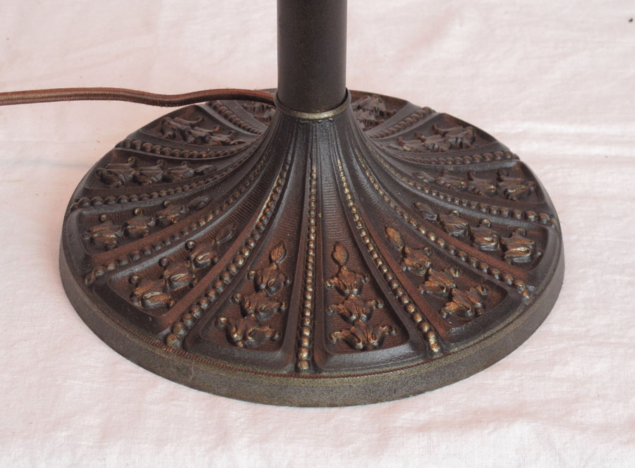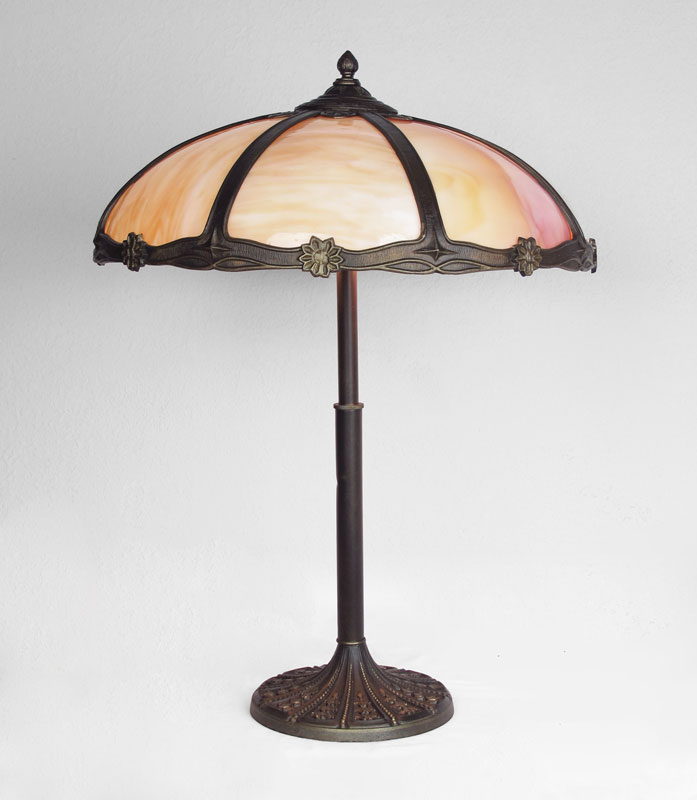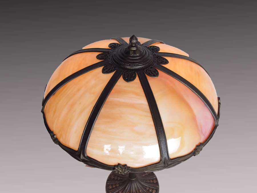 VINTAGE MILLER SLAG GLASS TABLE LAMP: 8 panel caramel slag glass shade, cast metal base marked Miller 1078. Base 24'' h. x 8'' dia., shade 5 3/4'' x 18 1/2''.