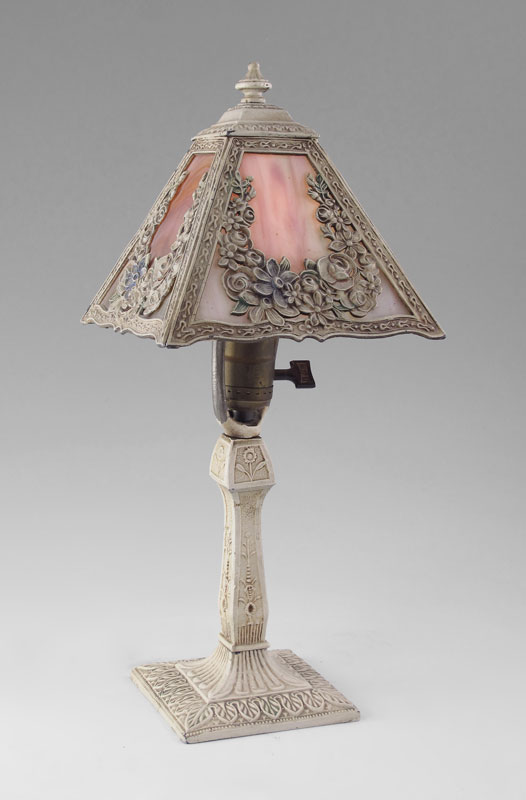 VINTAGE SLAG GLASS BOUDOIR LAMP: Four panel floral filigree over blue slag glass panels, original painted finish. Lamp measures 15 1/2'' tall, shade 6 1/2'' dia.