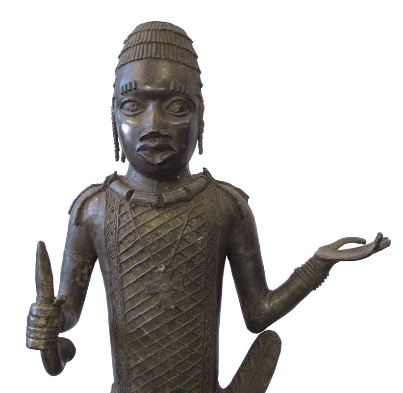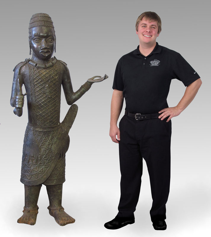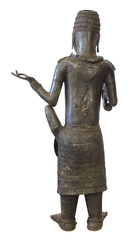 ALMOST 6 FT TALL BENIN AFRICAN WARRIOR BRONZE SCULPTURE WITH OUTSTRETCHED HAND: 5' 8'' h. x 2' 10'' x 17''.