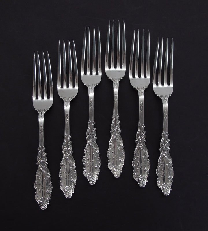 6 GORHAM STERLING LUXEMBOURG FORKS: 6 forks in the Luxembourg pattern by Gorham, 7 1/2''. Monogrammed S. Approx 10.4 troy oz.