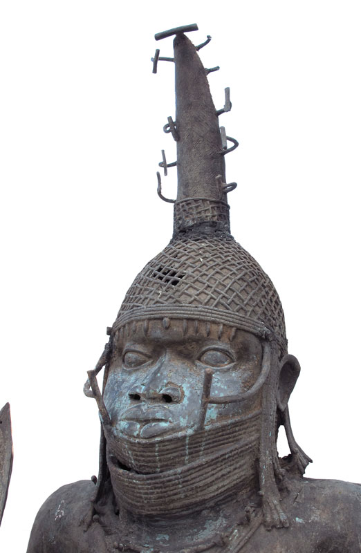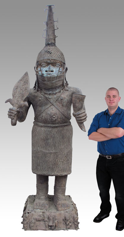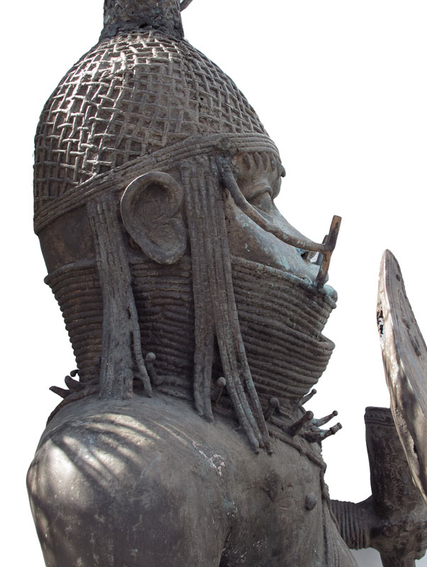 AFRICAN BRONZE BENIN WARRIOR CHIEF SCULPTURE: Approx. 110''h. x 39''w. x 36''d., square base approx. 29'' x 28''