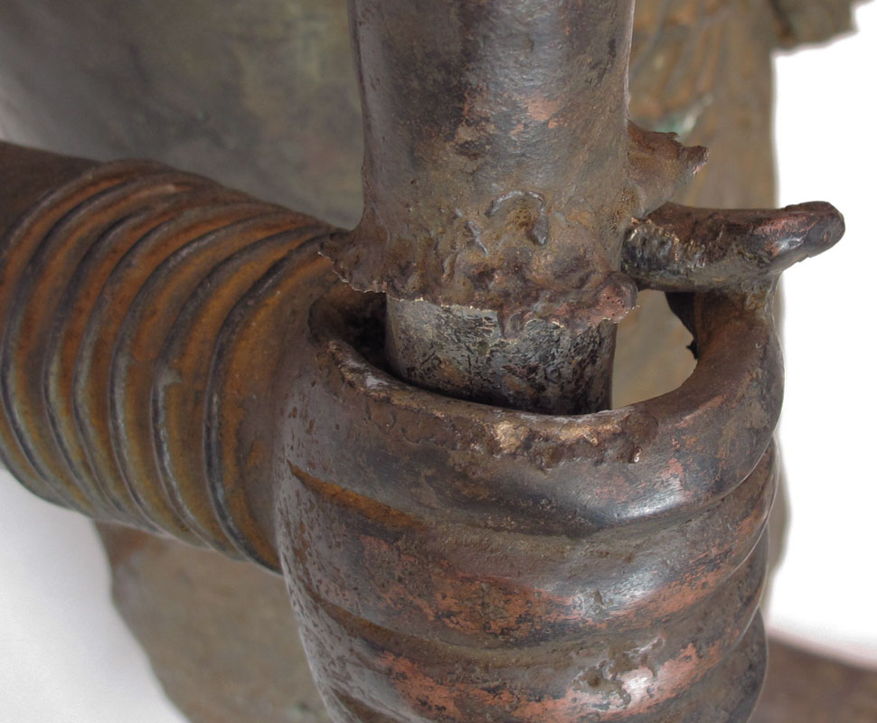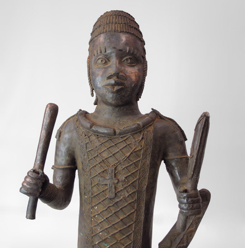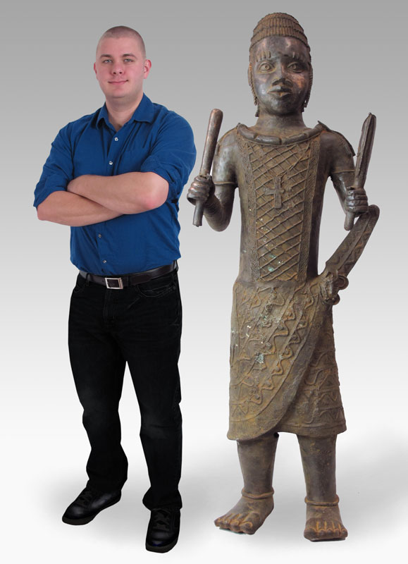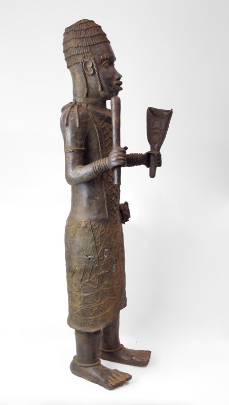 6 FT TALL BENIN AFRICAN BRONZE FIGURE SCULPTURE: Representing the tribal court announcer, approx. 5' 9'' x 2' 9'' x 17''. Lost wax process.
