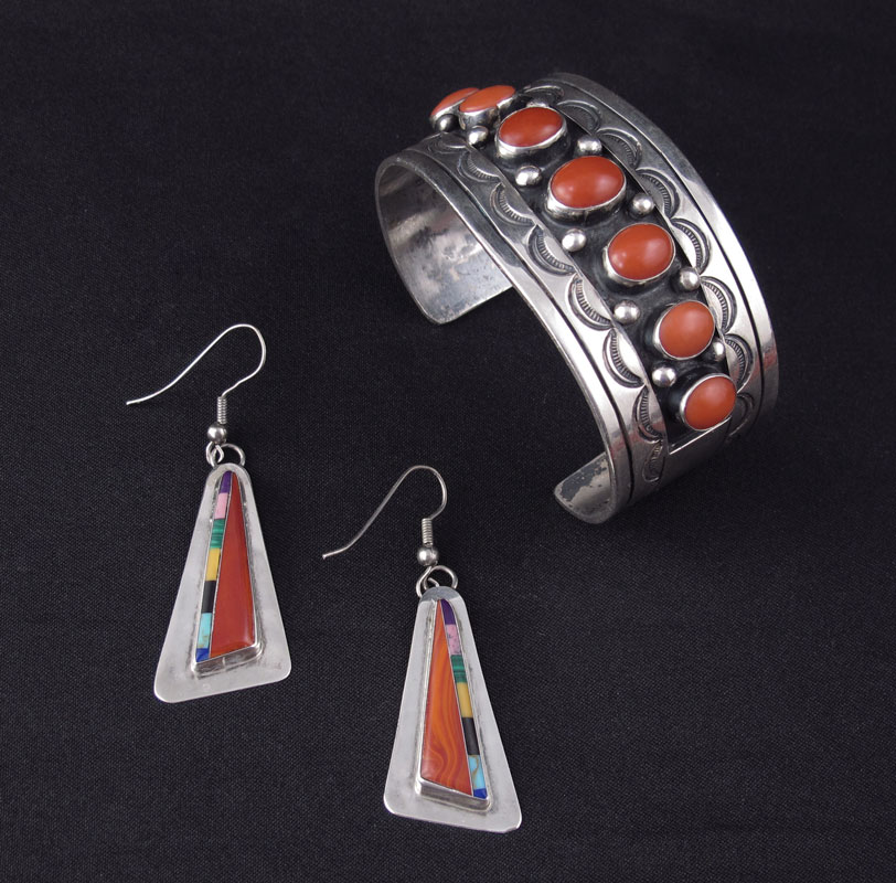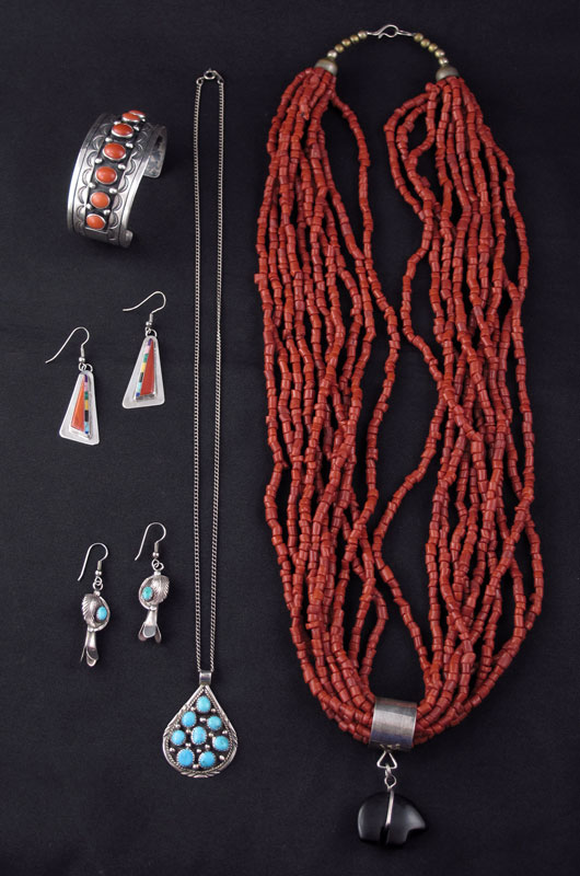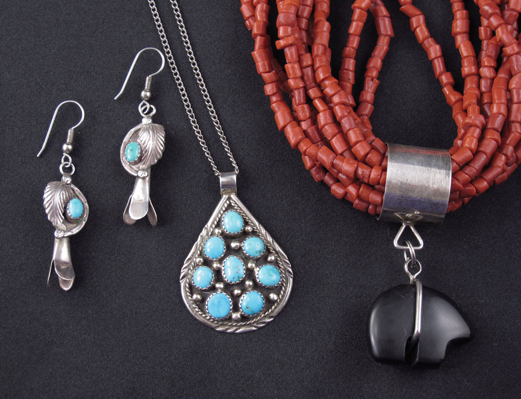 COLLECTION OF NATIVE AMERICAN JEWELRY: To include 1) 10 strand coral bead necklace with stone bear effigy, unmarked, 29 1/2'' l. 2) Sterling and turquoise pendant on chain, unmarked, pendant 1 3/4'' l. 3) Silver and coral cabochons cuff bracelet, unmarked, 2 1/2'' x 1 3/8''. 4) Multi stone geometric earrings marked DG, 1 1/2'' l. 5) Sterling and turquoise cabochon earrings, unmarked, 1 1/4''.