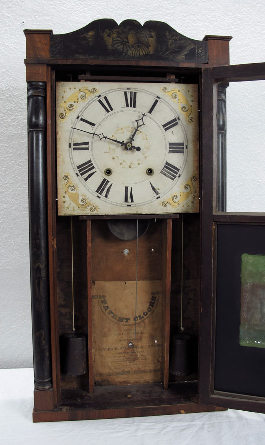 SEYMOUR, WILLIAMS & PORTER SHELF CLOCK: 19th century, mahogany veneer. Painted top crest, half column supports. Painted wood dial with Roman numerals. Reverse painted lower glass. Dual weight key and pendulum, time and strike movement. Interior paper label. 33 3/4'' h. x 17 1/2'' x 4 1/2''.