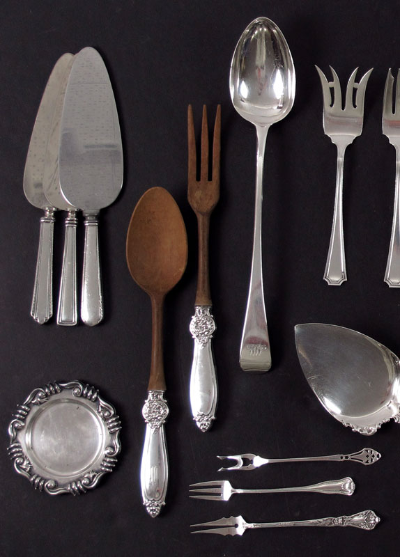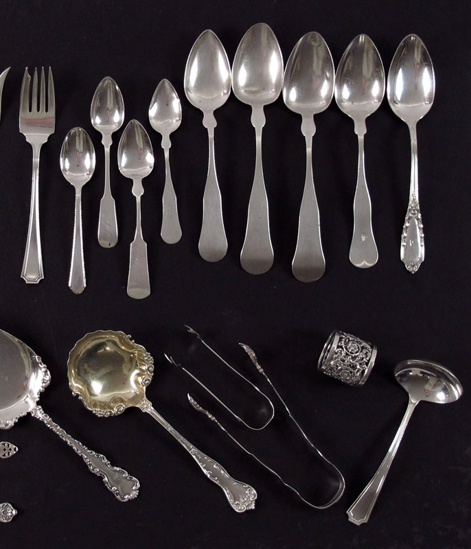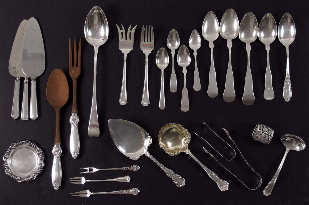 ESTATE COLLECTION OF AMERICAN & ENGLISH STERLING: Approx. 20 assorted serving and flatware pieces with highlight to include 1814 Eley & Fearn serving spoon, Whiting cake/pie server, Frank Smith berry spoon and more. Approx. 22.5 troy oz. sterling. Sold with 6 coin silver table and tea spoons, approx. 4.6 troy oz, and silverplate tablespoon and sugar tongs. Some pieces monogrammed. Some pieces monogrammed. Sold with silver chest, 4 1/4'' x 17 1/2'' x 14 1/4''.