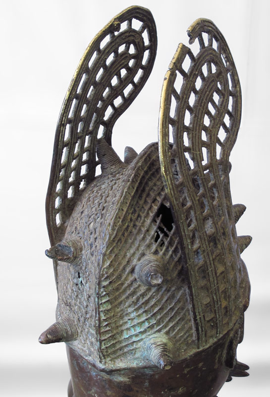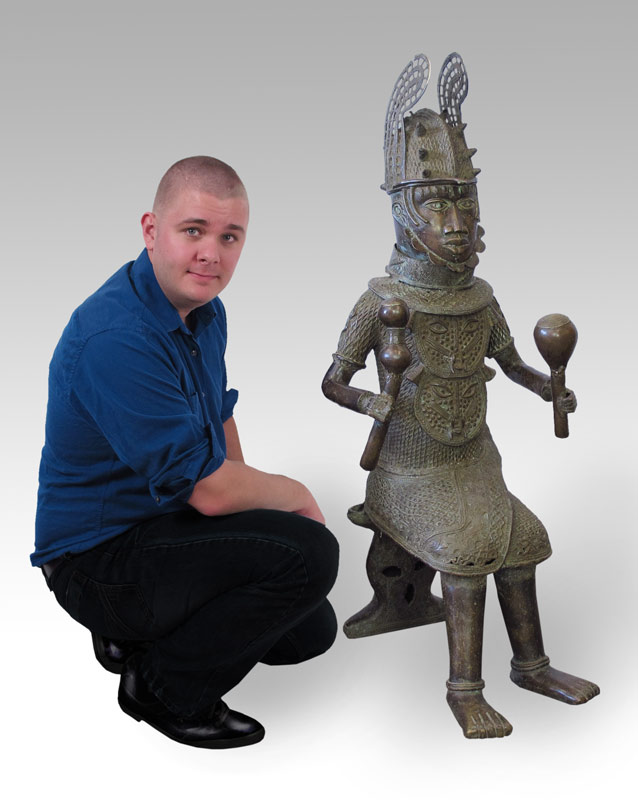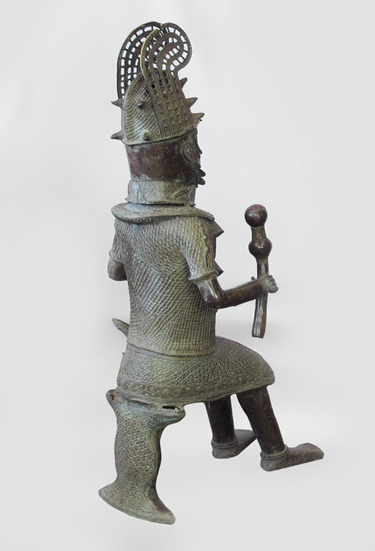 LARGE AFRICAN BENIN FIGURE SCULPTURE: Representing a warrior in full regalia, round weapon. Approx. 4' h. x 18'' x 2'.