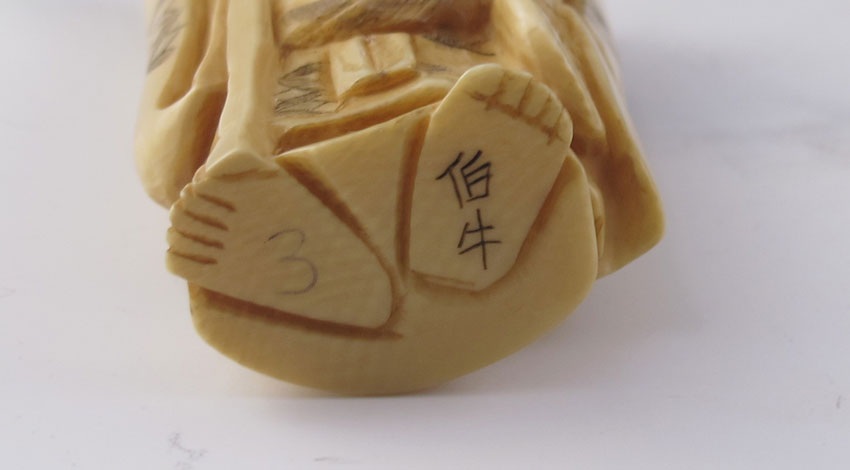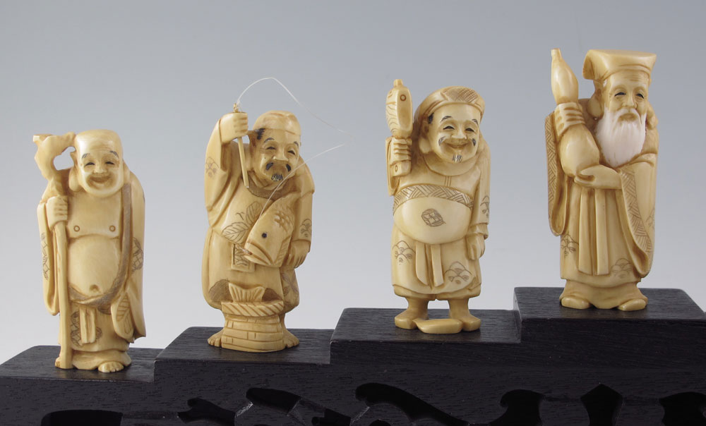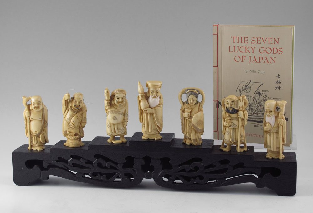7 PIECE CARVED IVORY LUCKY GODS WITH STAND: Set of 7 Japanese lucky gods, each measures approx. 3'' h. x 1 3/8''. Only one signed. Sold with carved wood stand 2 3/4'' h. x 15 3/4'' x 1 7/8'', and book on the lucky gods.