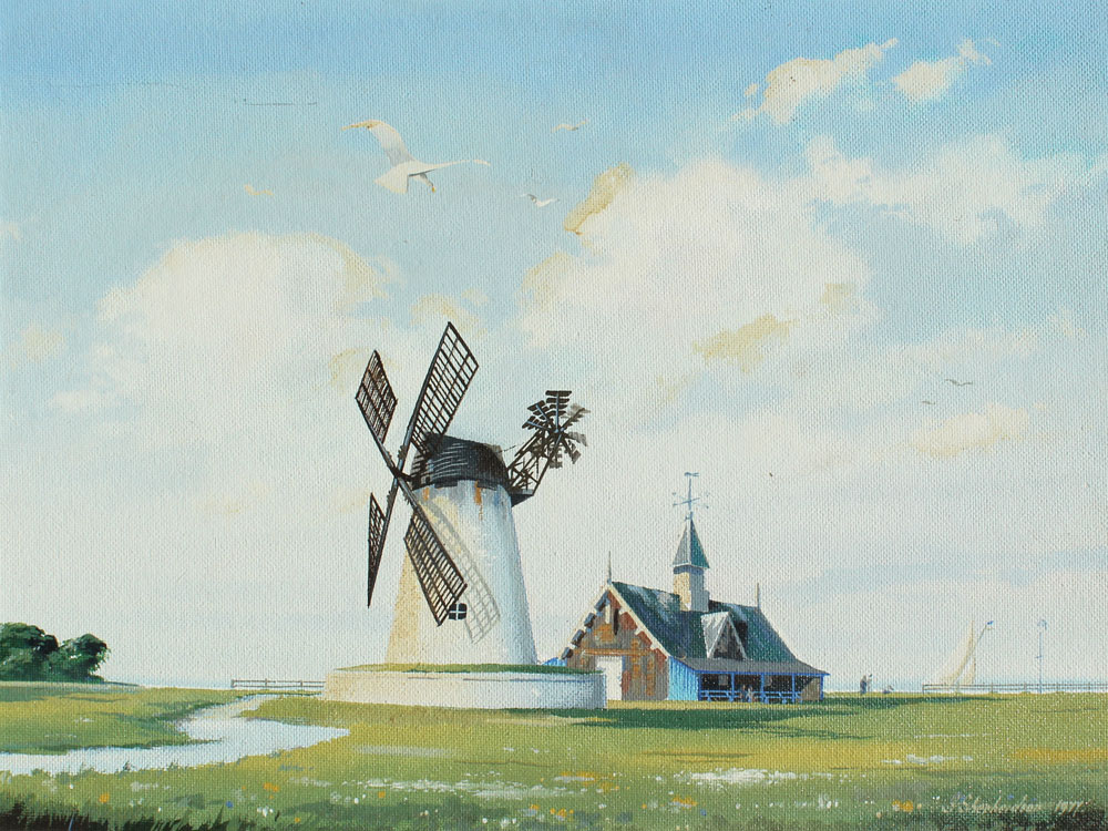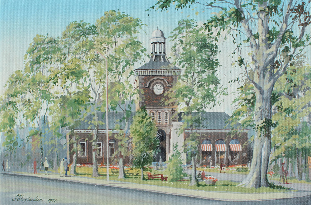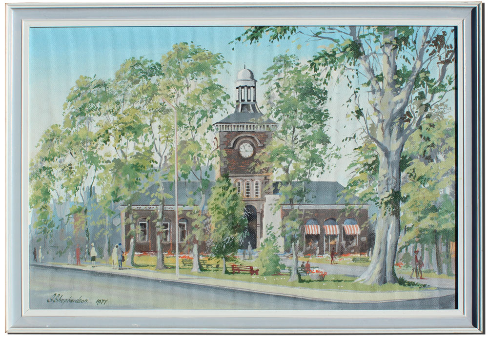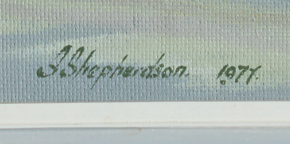 2 S. SHEPHERDSON VILLAGE SCENE PAINTINGS: Oil/Masonite, 18'' x 24'', signed lower right dated 1977, painted white frame, 20'' x 26''.