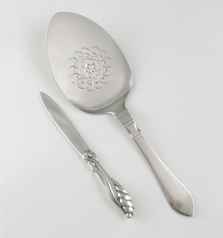 GEORG JENSEN LETTER OPENER & CAKE / PIE SERVER: To include 1) Circa 1920's cake / pie server in the Continental pattern by Georg Jensen. 10'' l. Approx. 3.7 troy oz. 2) Circa 1930's solid sterling silver letter opener in unknown pattern by Georg Jensen. 6 3/8'' l. Approx. 1 troy oz.