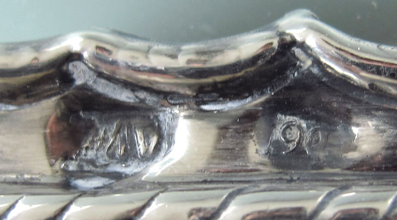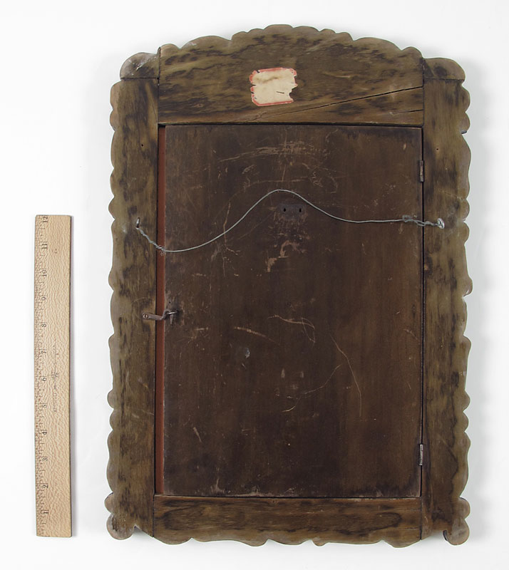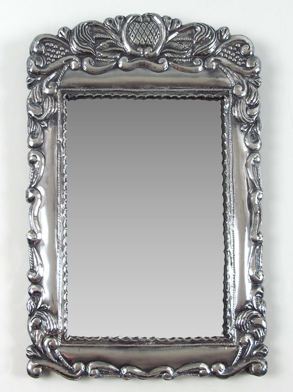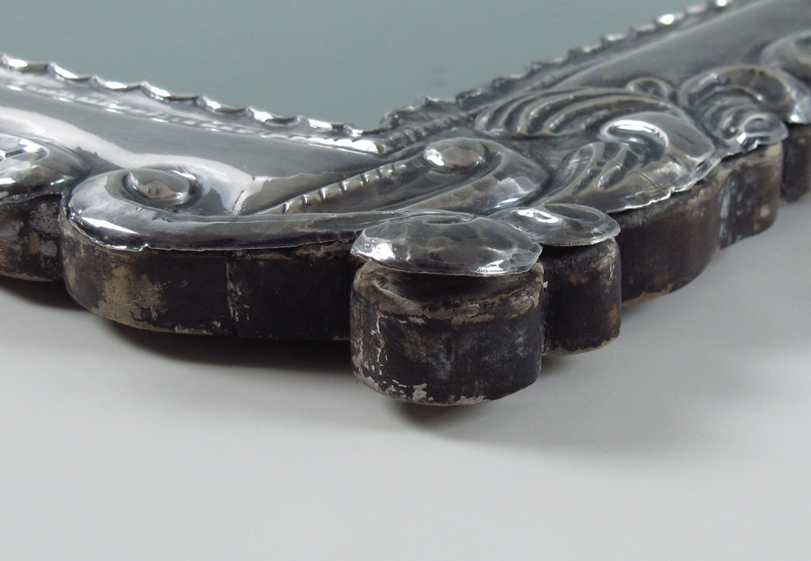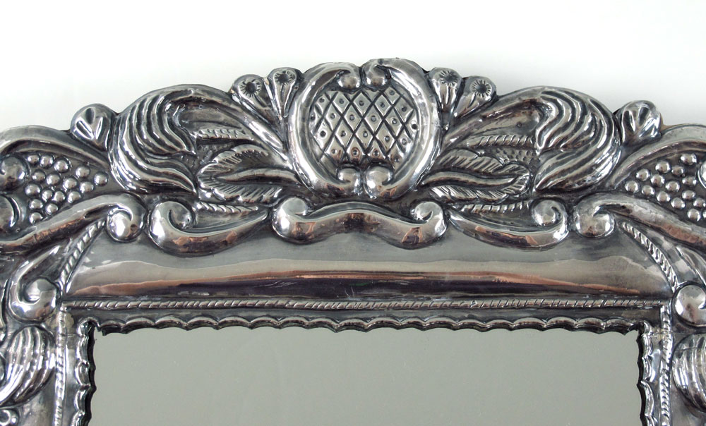 SILVER REPOUSSE WALL MIRROR: Repousse floral motif over wood backing, hinged back for ease of mirror or picture placement. Illegible hallmark, possible Argentinian .900 silver. 19'' h. x 13 1/4''.