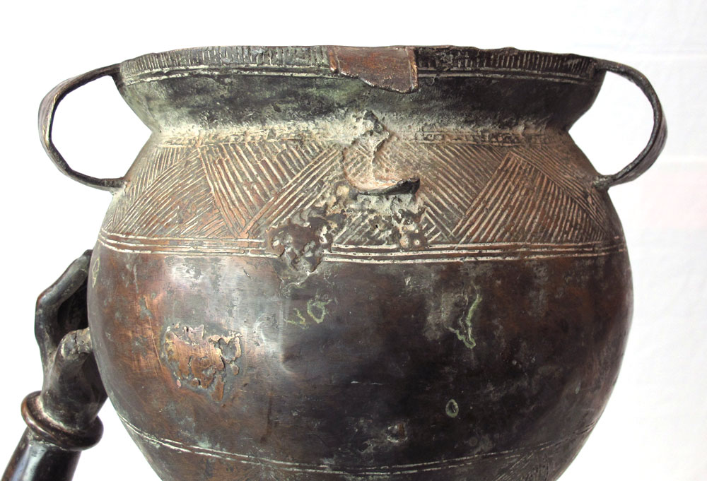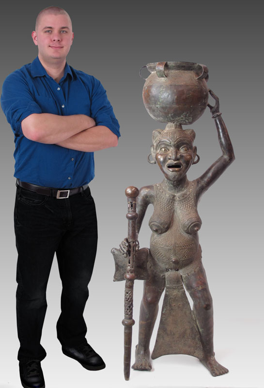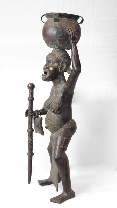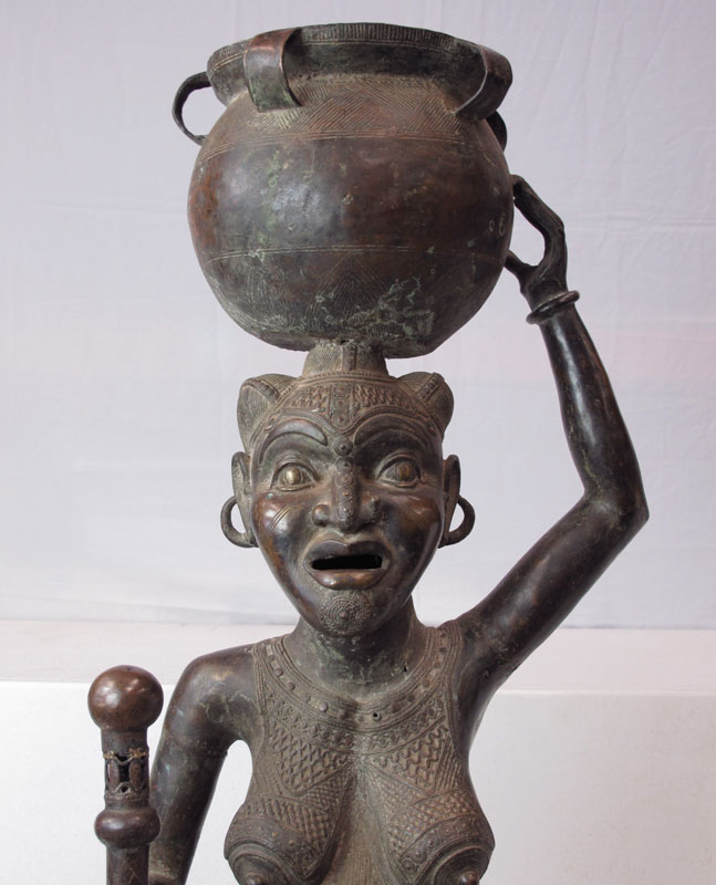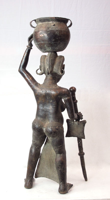 LARGE BAMUN AFRICAN BRONZE WOMAN SCULPTURE: Offering pot on her head. 4' 8'' h. x 1' 9 1/2'' x 1'