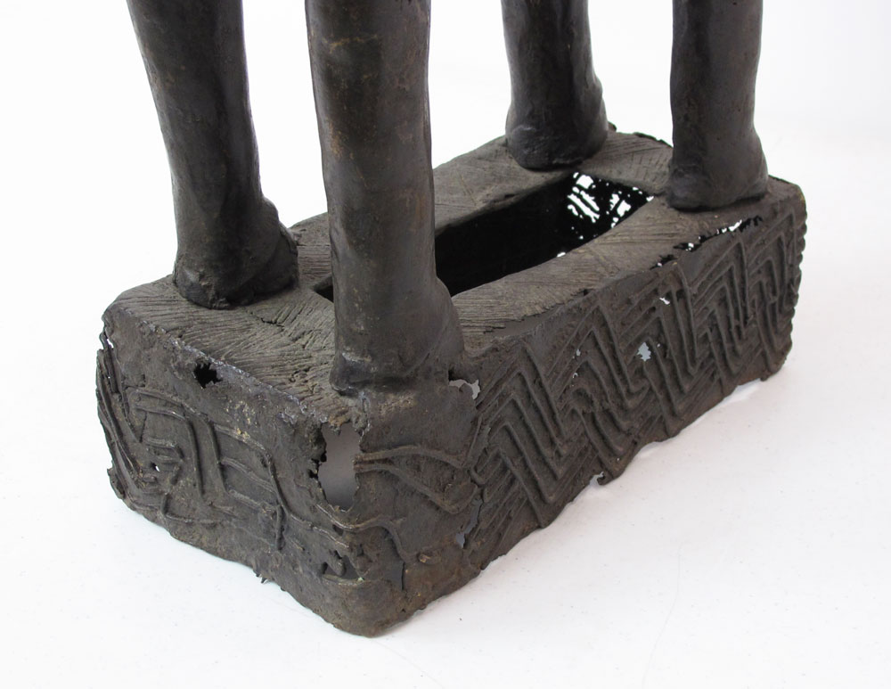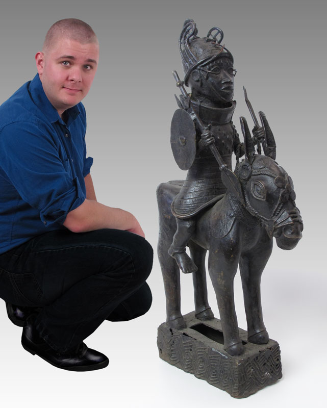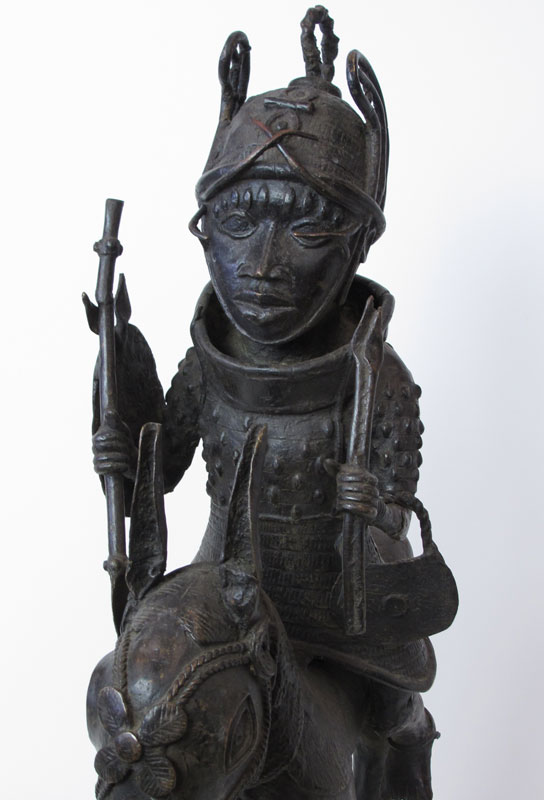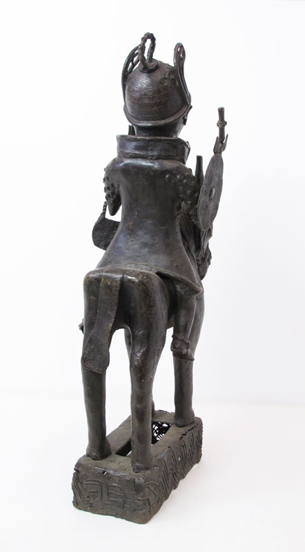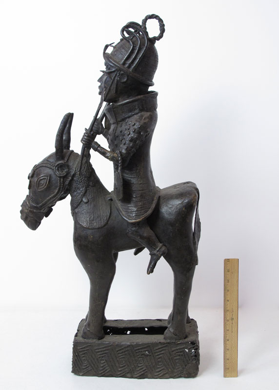BENIN AFRICAN BRONZE WARRIOR ON HORSE SCULPTURE: 3' x 1' 6'' x 7''.