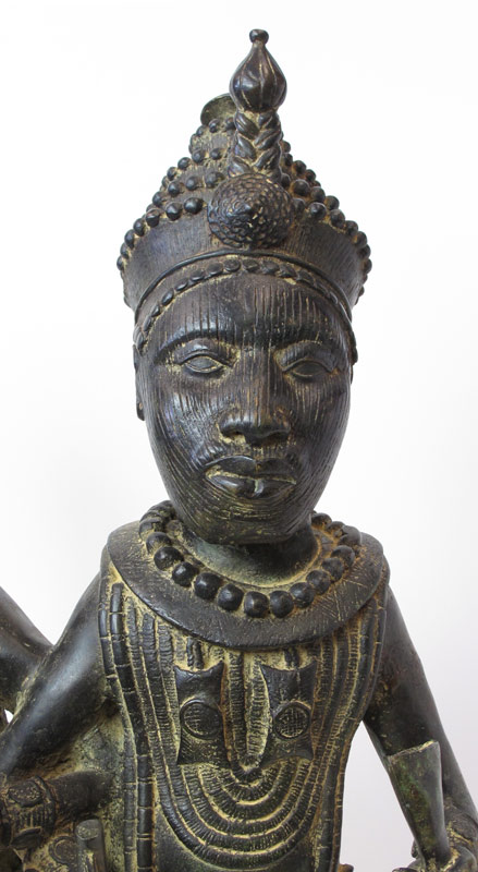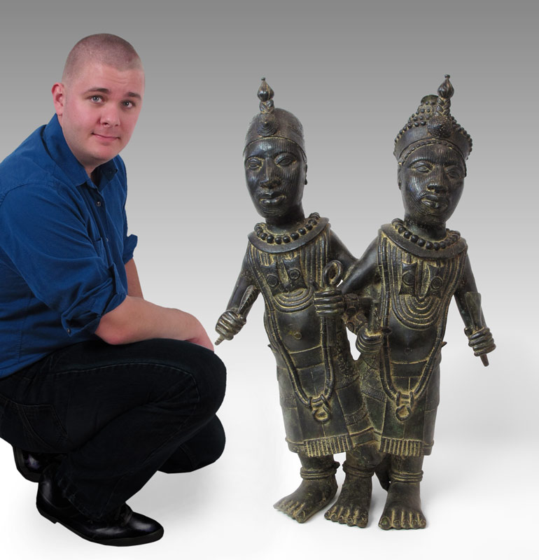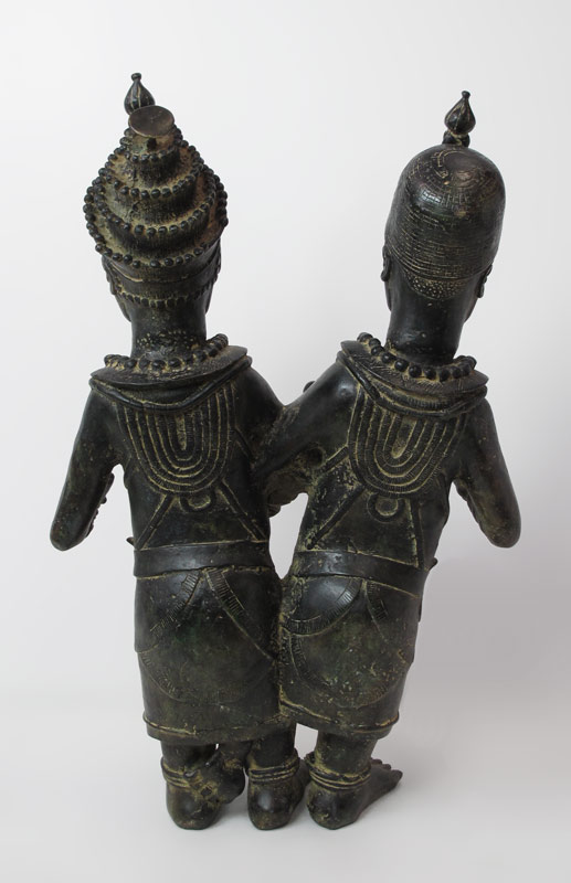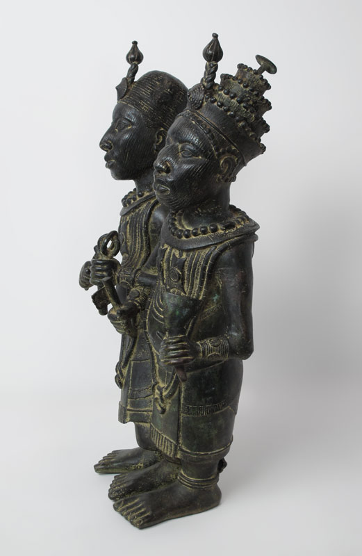 IFE AFRICAN CONJOINED FIGURES SCULPTURE: Full bodied twins, joined and with three legs between them. 2' 10'' x 1' 9'' x 9 1/2''.