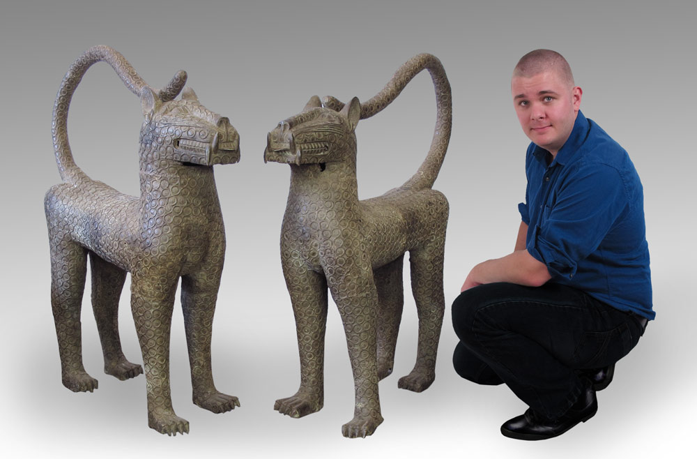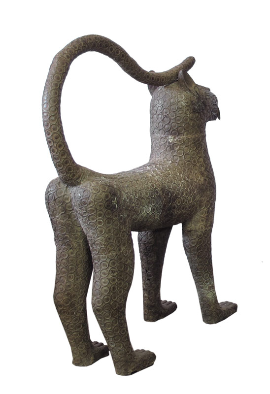 PAIR OF LARGE AFRICAN METAL BENIN LEOPARD SCULPTURE: Each approx. 4' h. x 11'' x 3' 5''.