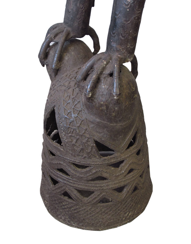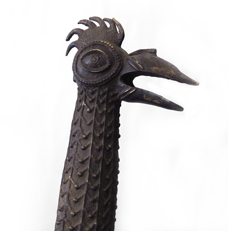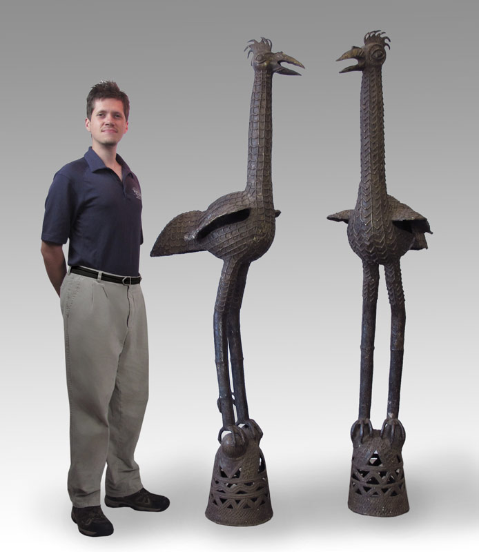 PAIR OF LARGER THAN LIFE TIKAR AFRICAN METAL BIRDS SCULPTURE: A chiefs showing of prosperity to have these birds. One approx 6' 6'' x 15 1/2'' x 2' 6 1/2'', other 6' 5 1/2'' x 16'' x 2' 7''.