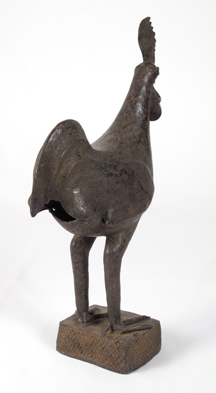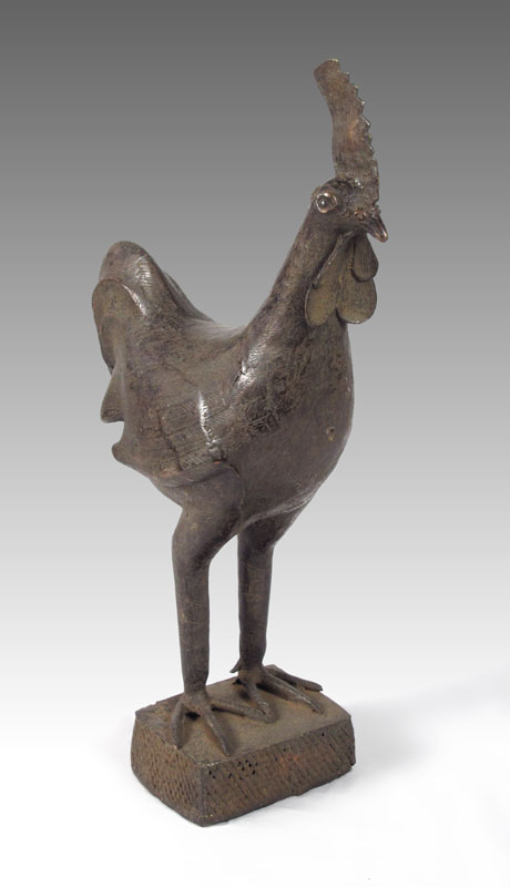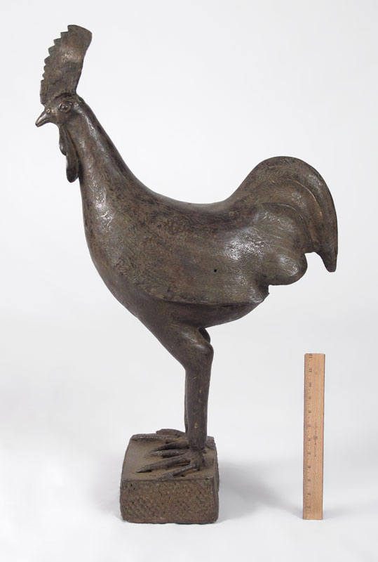 BENIN AFRICAN CAST METAL ROOSTER SCULPTURE: Approx. 2' 10 1/2'' h. x 9 1/2'' x 1' 9''.