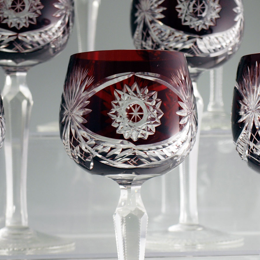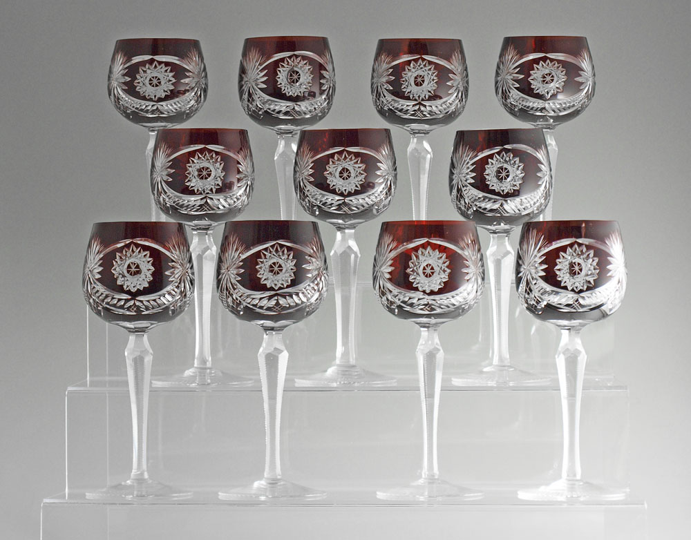 SET OF 11 BOHEMIAN RUBY CUT TO CLEAR WINE STEMS: 7 1/2'' tall.