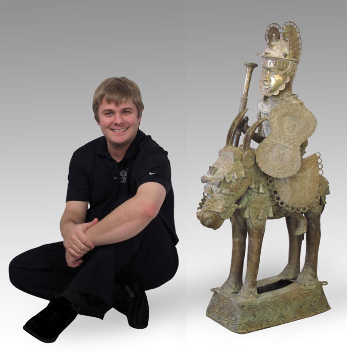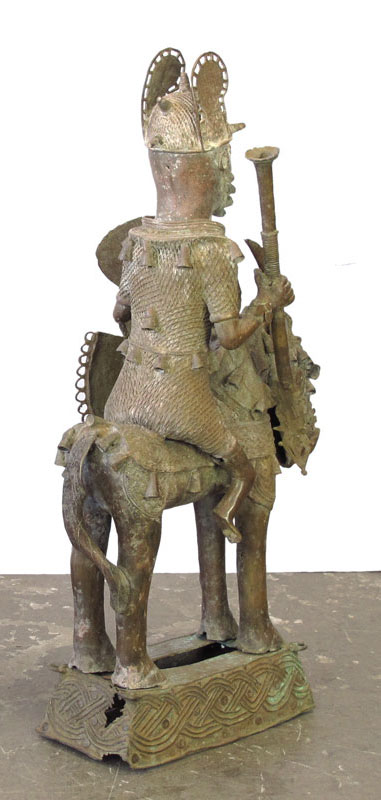 AFRICAN BENIN WARRIOR ON HORSEBACK SCULPTURE: In full regalia. Approx. 4' 1'' x 1' 4'' x 2' 3''.