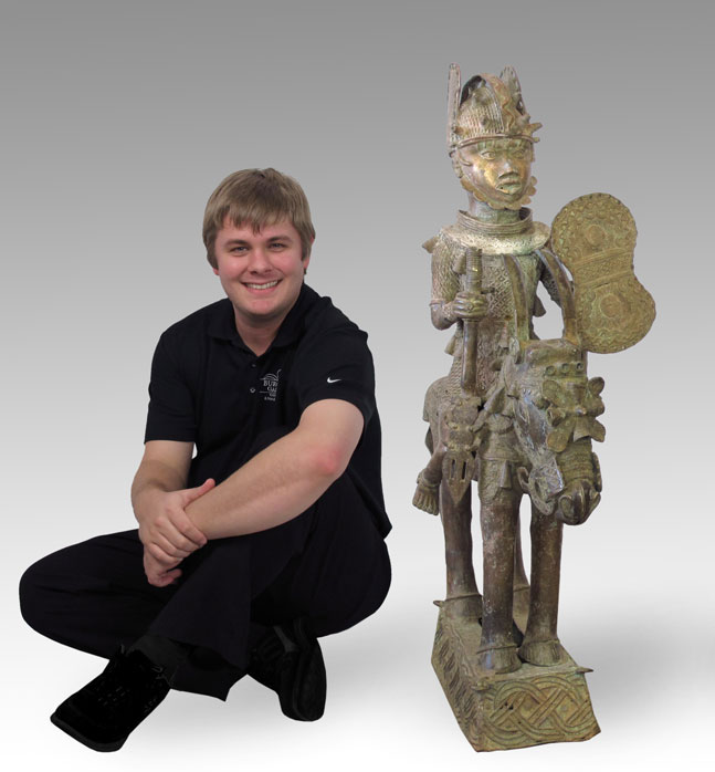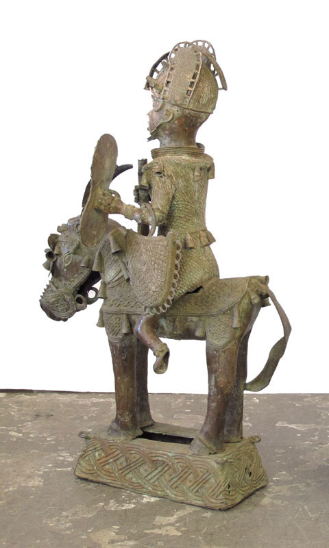AFRICAN BENIN WARRIOR ON HORSEBACK SCULPTURE: Full regalia, 4' x 2'3'' x 1'4''.