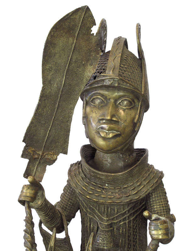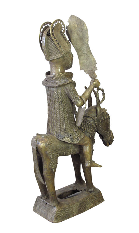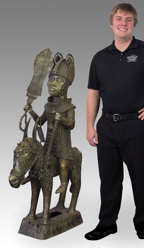 BENIN AFRICAN BRONZE WARRIOR ON HORSE SCULPTURE: 4' 6'' x 1' 4'' x 2' 3''