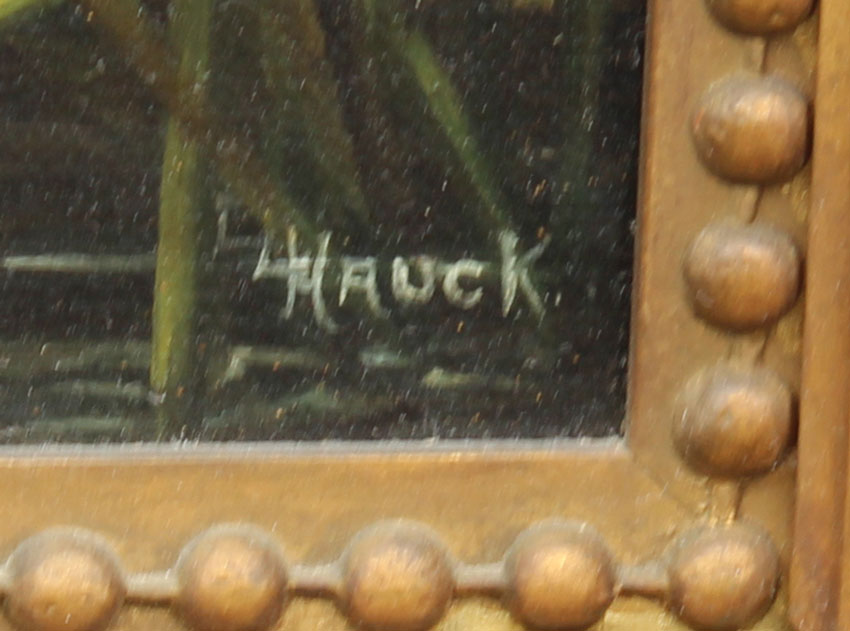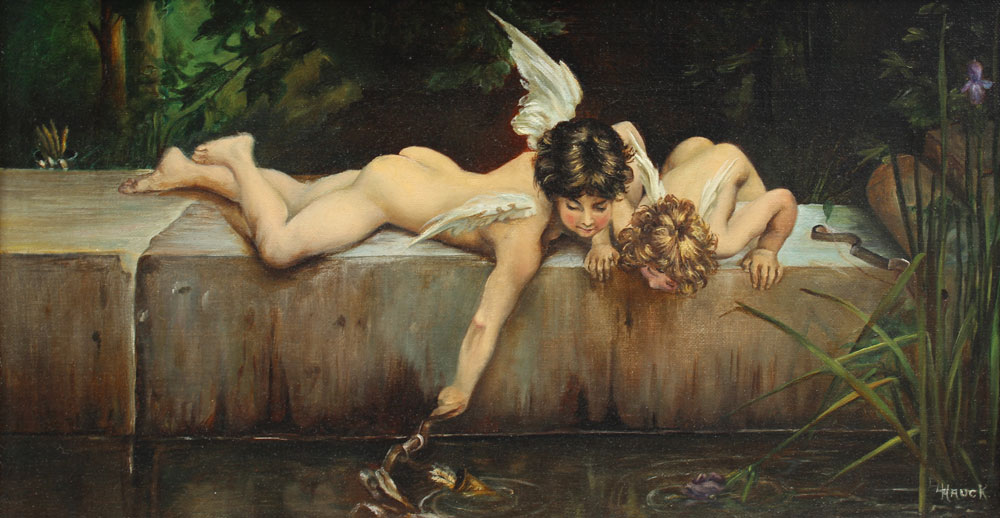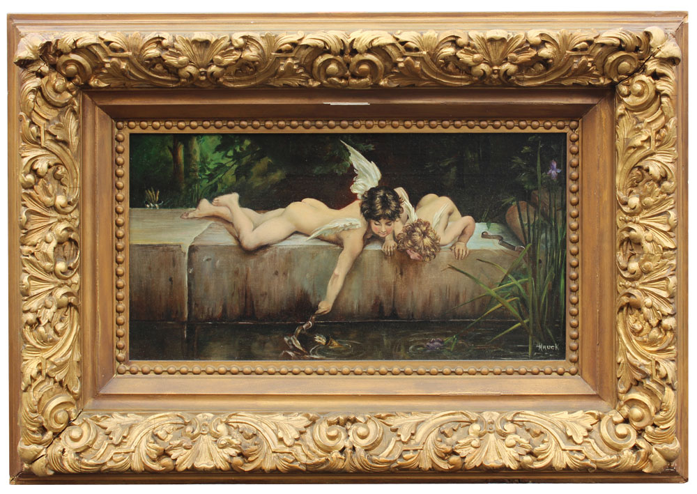 AN ANGEL RETRIEVING CUPIDS QUIVER FROM A POOL OF WATER: 19th C. reproduction after the original, OIL/Canvas, 9'' x 17'', signed lower right Hauck, encased in gilded and carved gesso frame with overpaint and minor wear, 17 1/2'' x 25 1/2''.