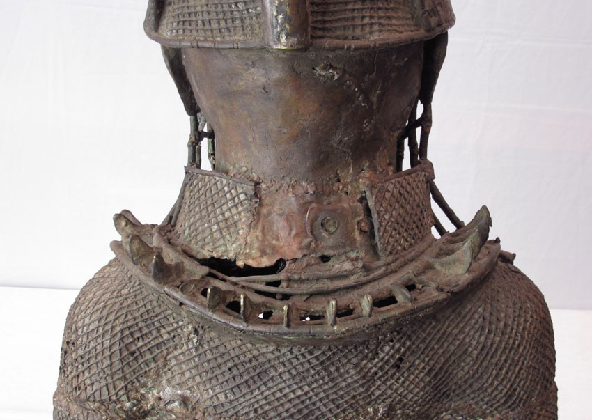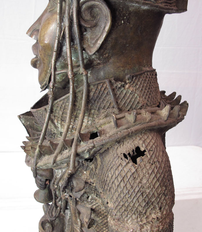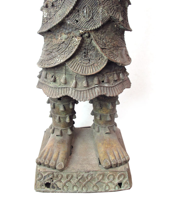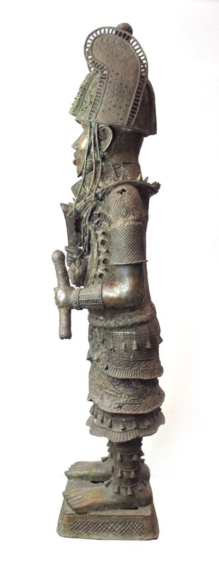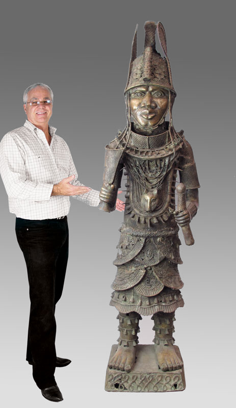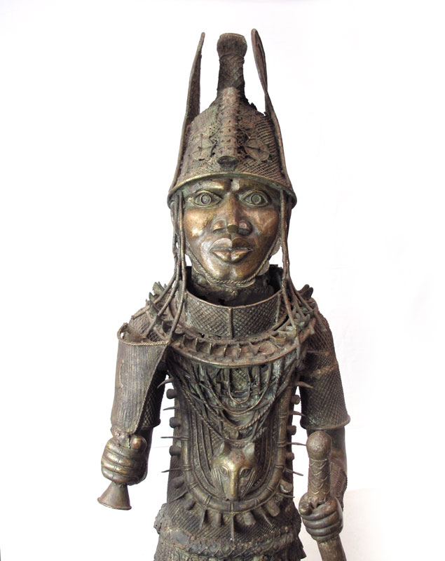 AN IMPORTANT BENIN AFRICAN CAST METAL WARRIOR SCULPTURE: Finely detailed and dressed in full. Note the leopard on his chest, a symbol of great importance in the tribe. Measures approx. 6'10'' x 20' x 24''.