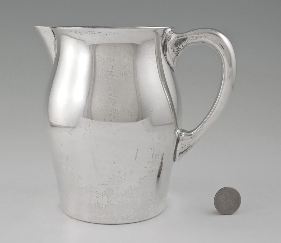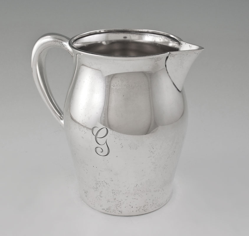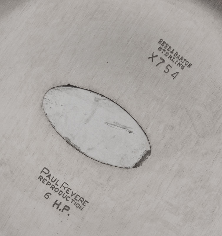 REED & BARTON PAUL REVERE STERLING PITCHER: Marked on base Reed & Barton Sterling, X754, ''aul Revere Reproduction, 6 H.P.'' Monogrammed G. 6 1/4'' h. x 7''. Approx. 16.8 troy oz.