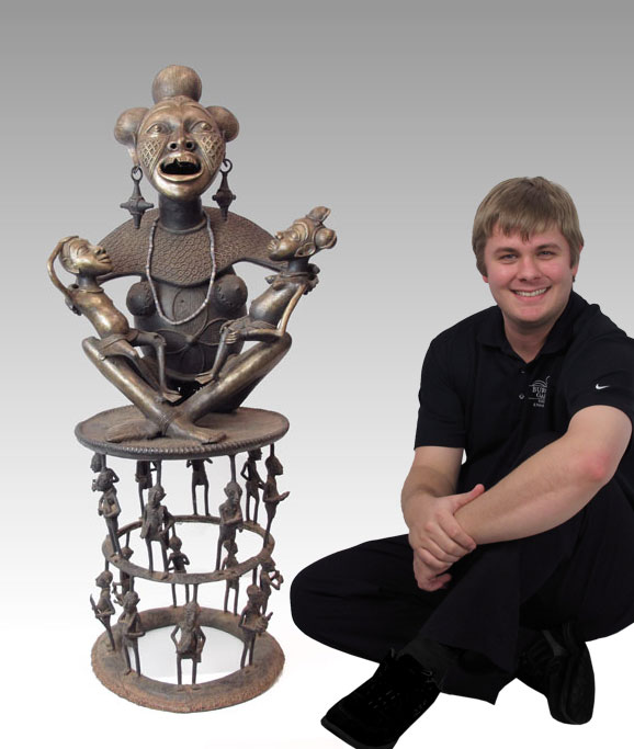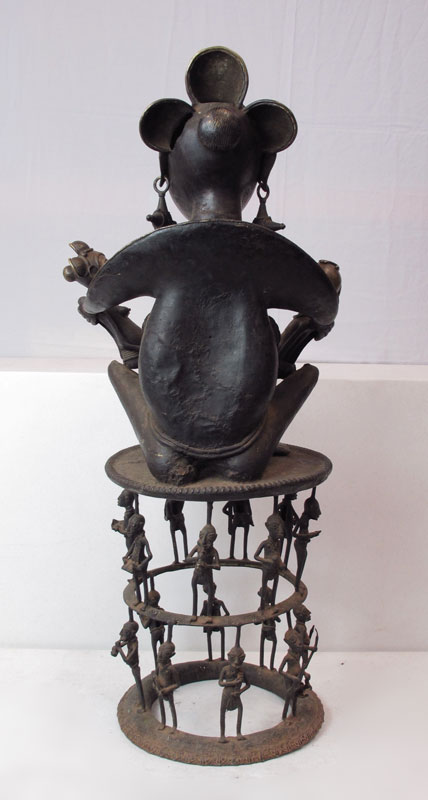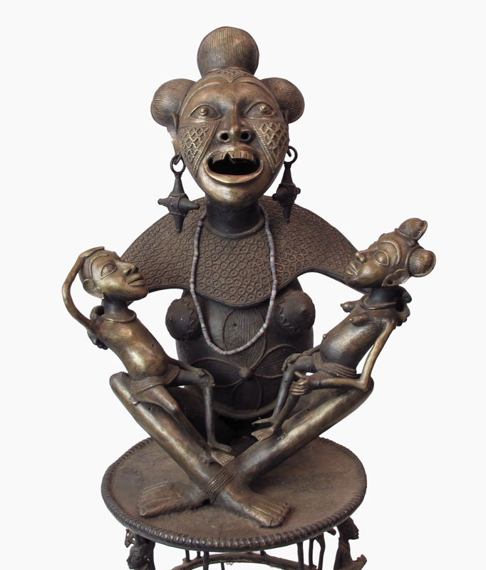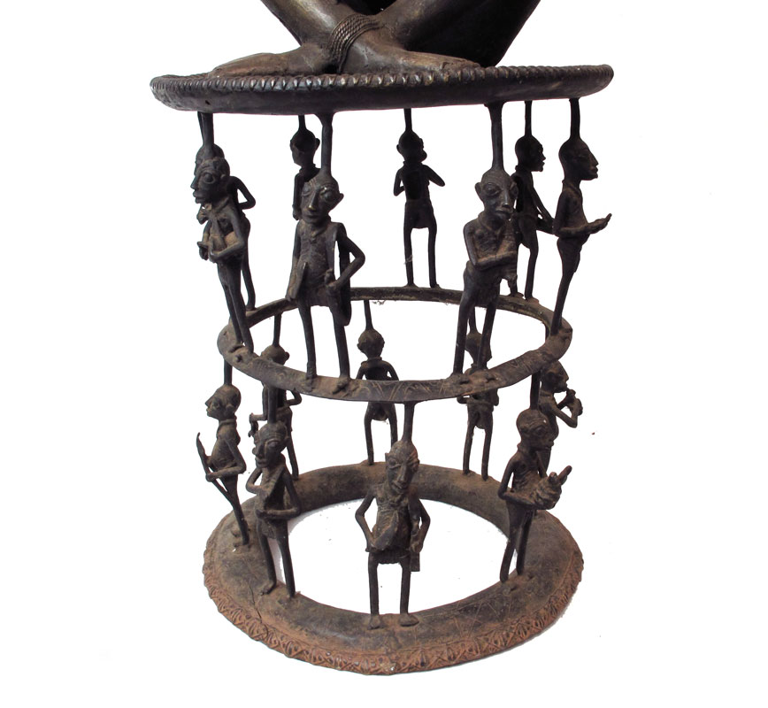TIKAR CAMEROON MATERNITY FIGURAL GROUP SCULPTURE: Cast metal mother with twin children on her lap. All on a figural seat. Approx. 4' 6 1/2'' x 2' x 1' 7''