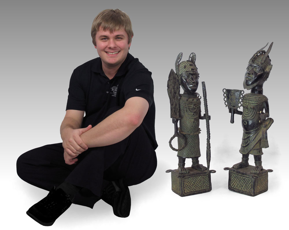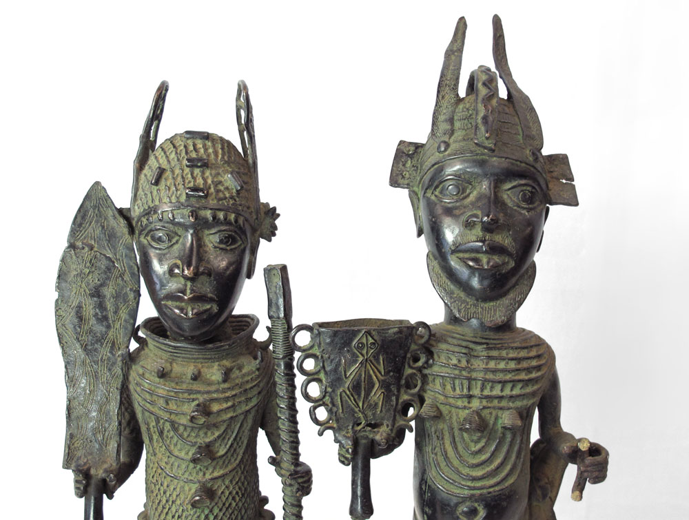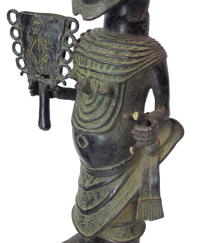TWO AFRICAN BRONZE WARRIOR FIGURAL SCULPTURES: Approx. 29'' h. x 7'' x 7 1/2''