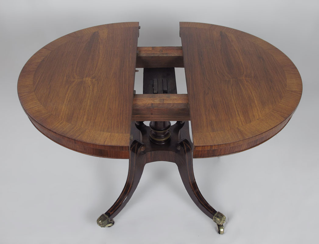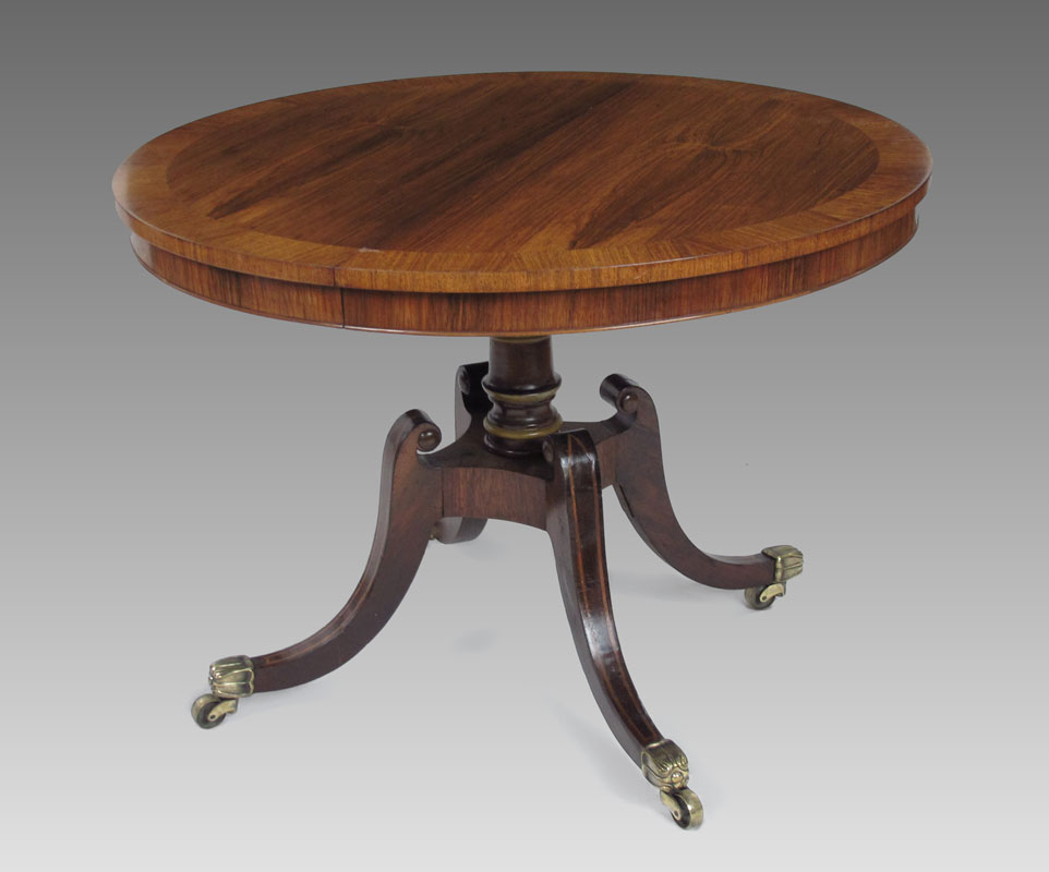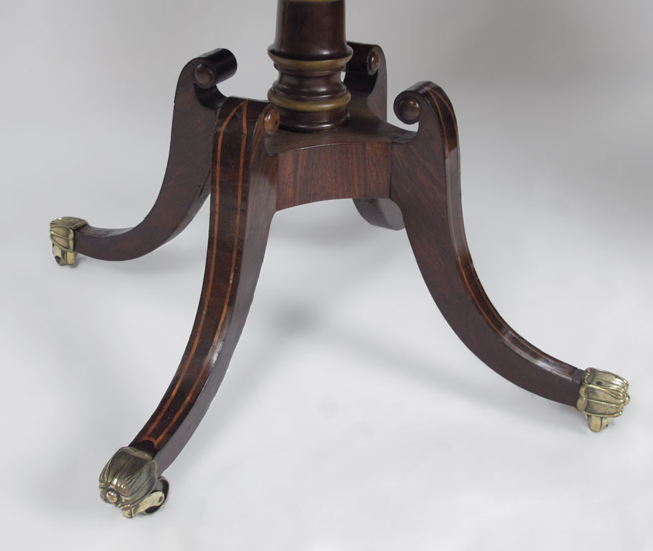 19th C ENGLISH BANDED MAHOGANY CENTER TABLE: Round table, turned shaft, string inlay splay legs ending in brass castors. Approx. 28''h. x 38'' dia.