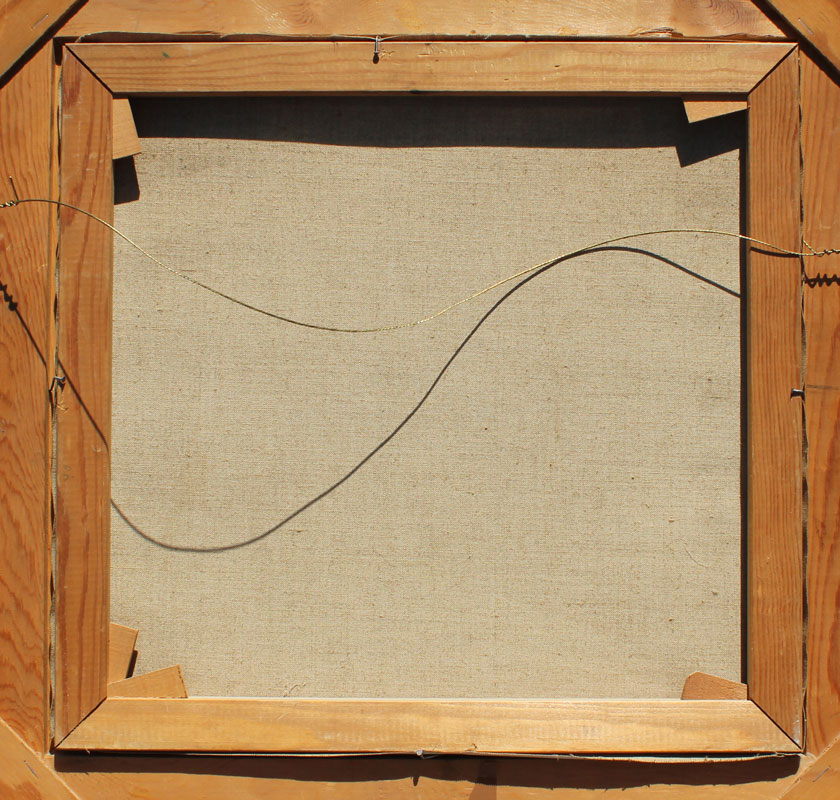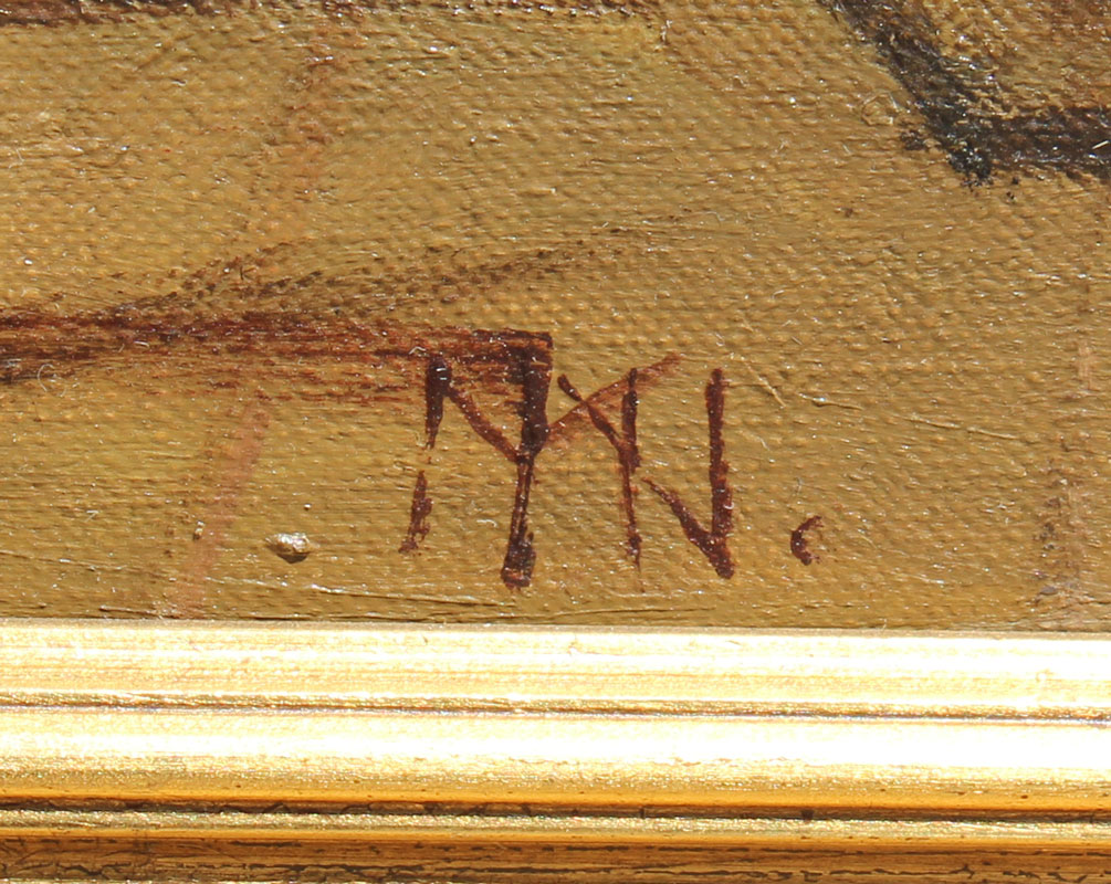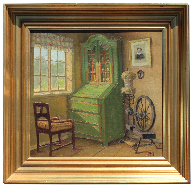 ILLEGIBLY SIGNED DUTCH INTERIOR WITH SPINNING WHEEL: OIL/Canvas, 16'' x 16 1/2'', monogrammed lower right, gilded frame, 21'' x 20 1/2''.