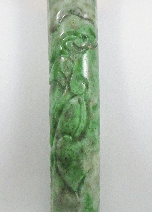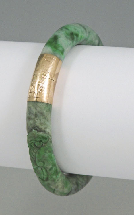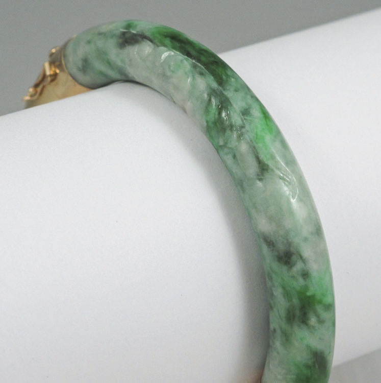 CARVED JADEITE JADE & 14K GOLD BANGLE BRACELET: 14K yellow gold mounted bracelet, hinged closure with figure 8 clasp and safety chain, 81.5 mm dia., interior 2 1/2''.