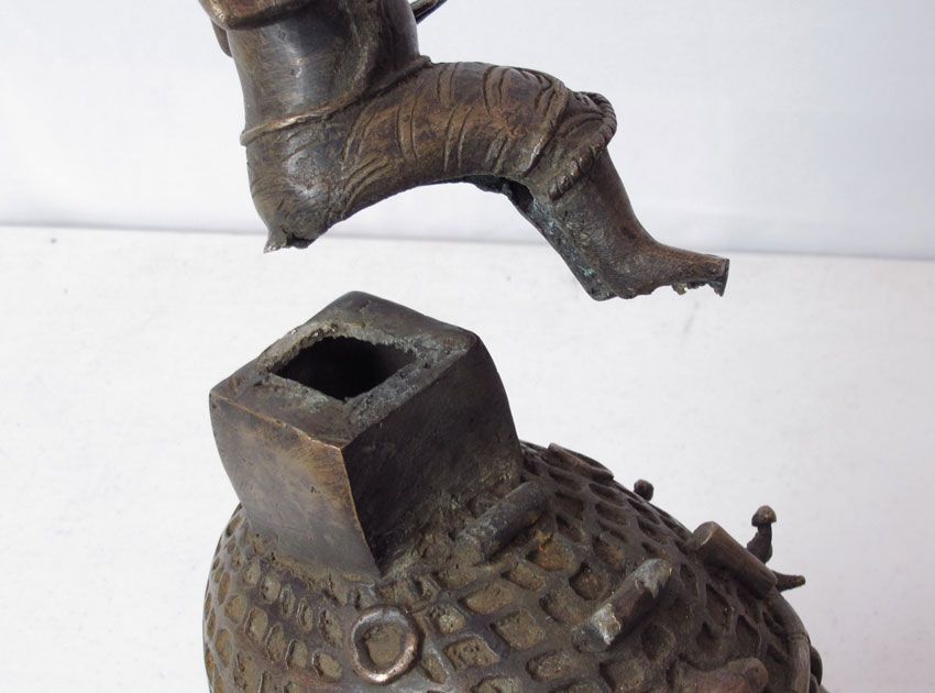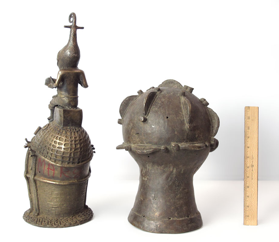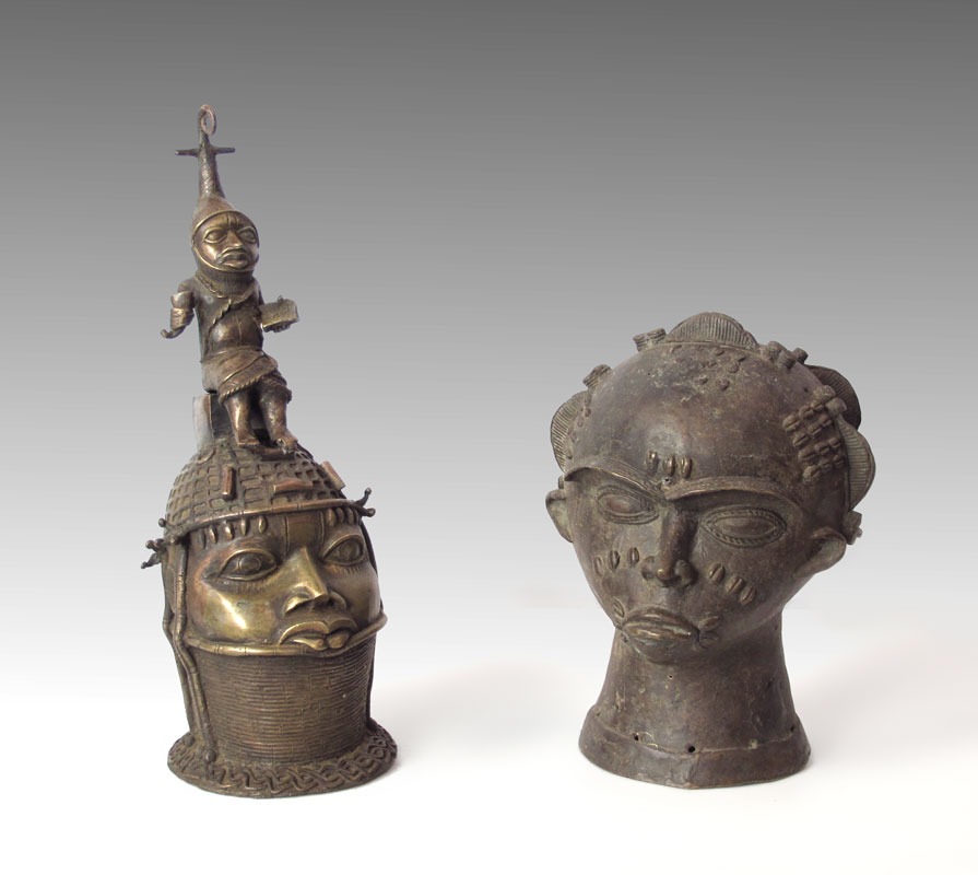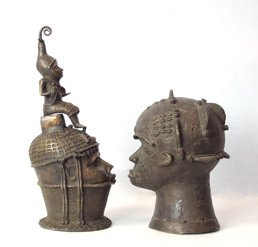 TWO BENIN AFRICAN HEAD FIGURES SCULPTURE: One measures 15'' h. x 10 1/2'' x 10 1/2'', other 21 1/2'' h. x 8 1/2'' x 9''.