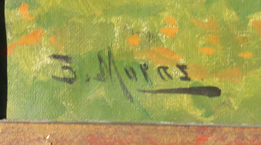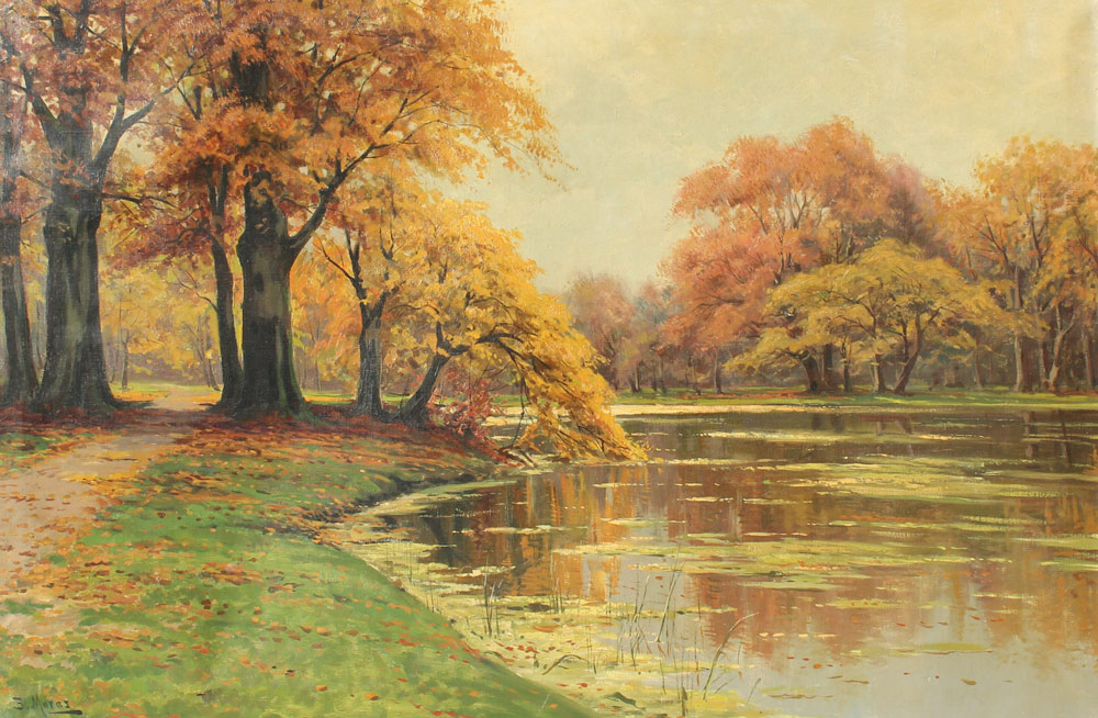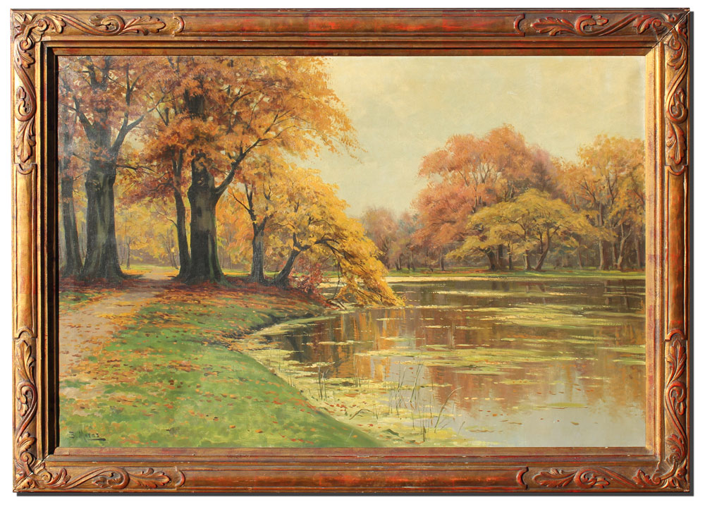 MORAS, Bruno Max, (German, 19th/20th C.): Serene Riverside Landscape, OIL/Canvas, 31'' x 47'', signed lower left, encased in a period carved and gilded impressionist frame with wear, 38'' x 53''.