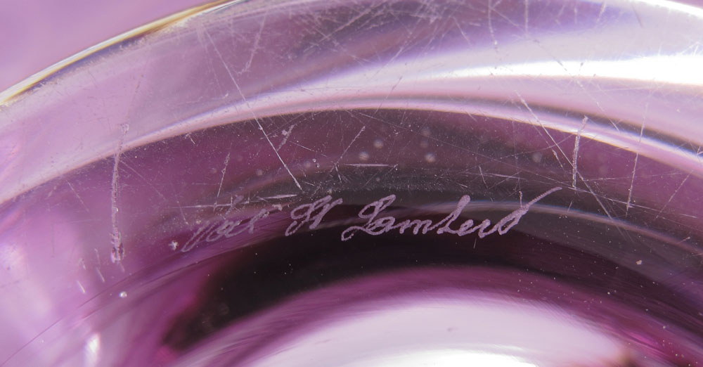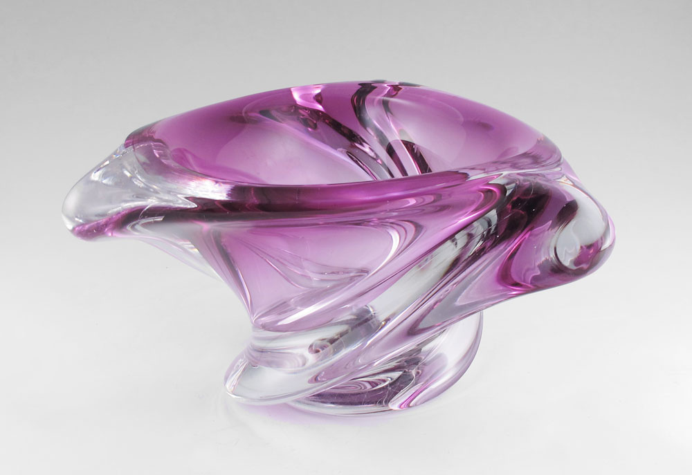 VAL ST LAMBERT THICK WALLED SWIRL BOWL: Fuchsia to clear glass, signed in script. Approx. 6'' tall, 11'' dia. overall.