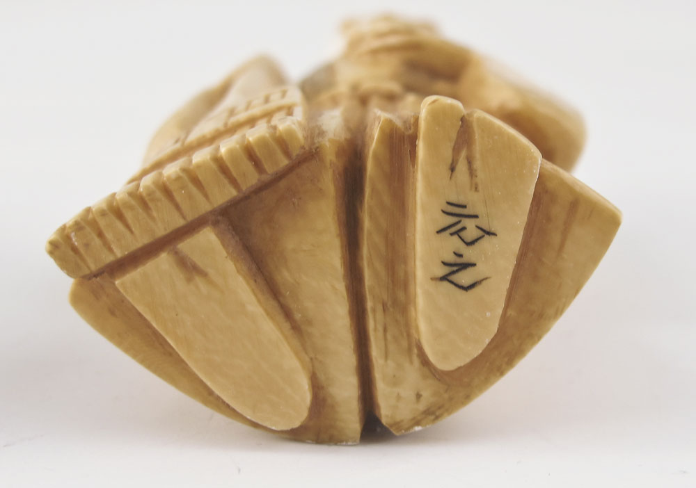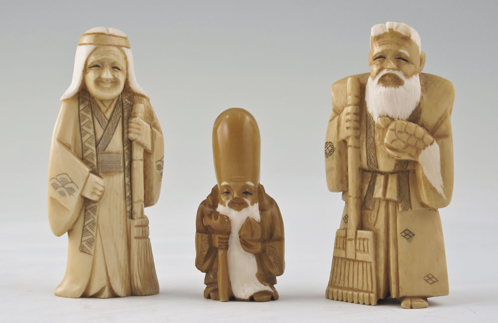 3 PIECE CARVED IVORY FIGURAL OKIMONO: To include 1) Elder man with turtle and rake, signed, 3 1/8'' h. x 2''. 2) Woman holding broom, 3'' h. 3) Japanese immortal Fukurokuju netsuke, 2 1/8'' h.