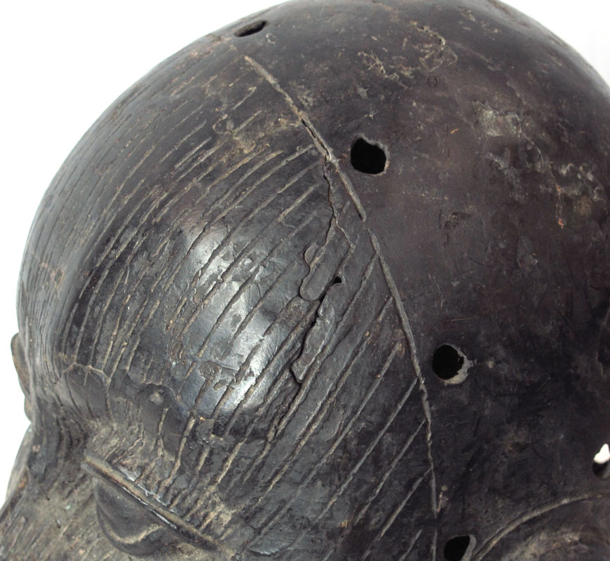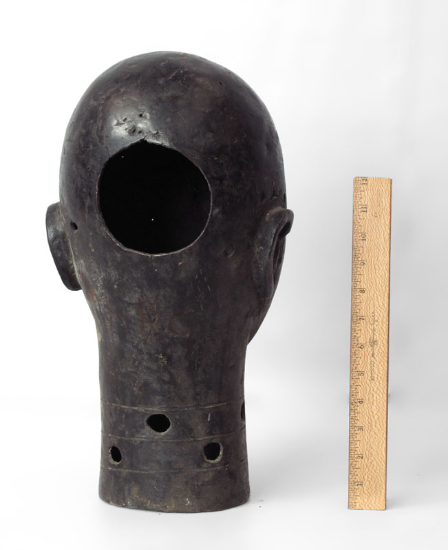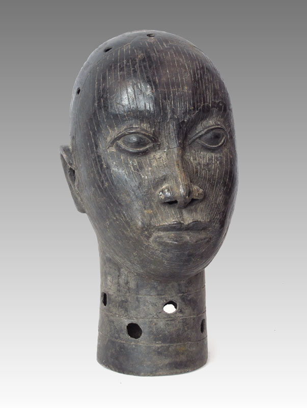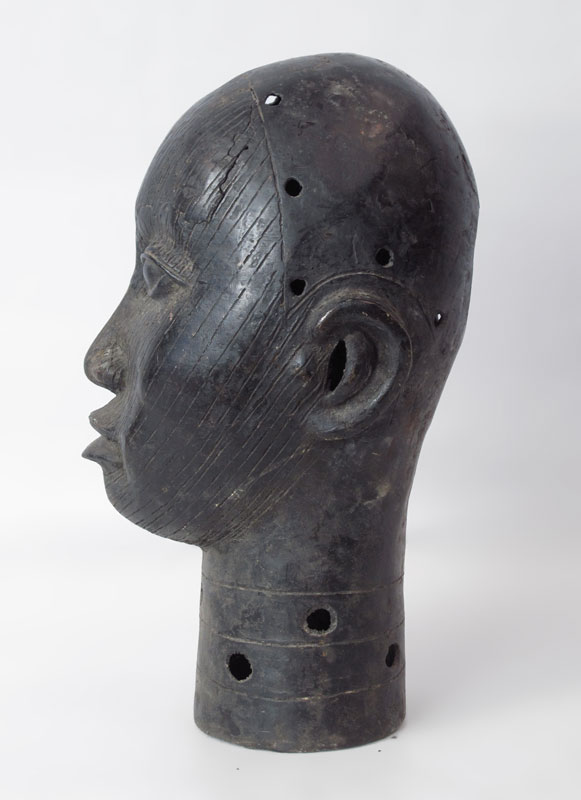 NIGERIAN AFRICAN BRONZE HEAD SCULPTURE: Open head with pierced holes through out. 17'' h. x 8'' x 10''.